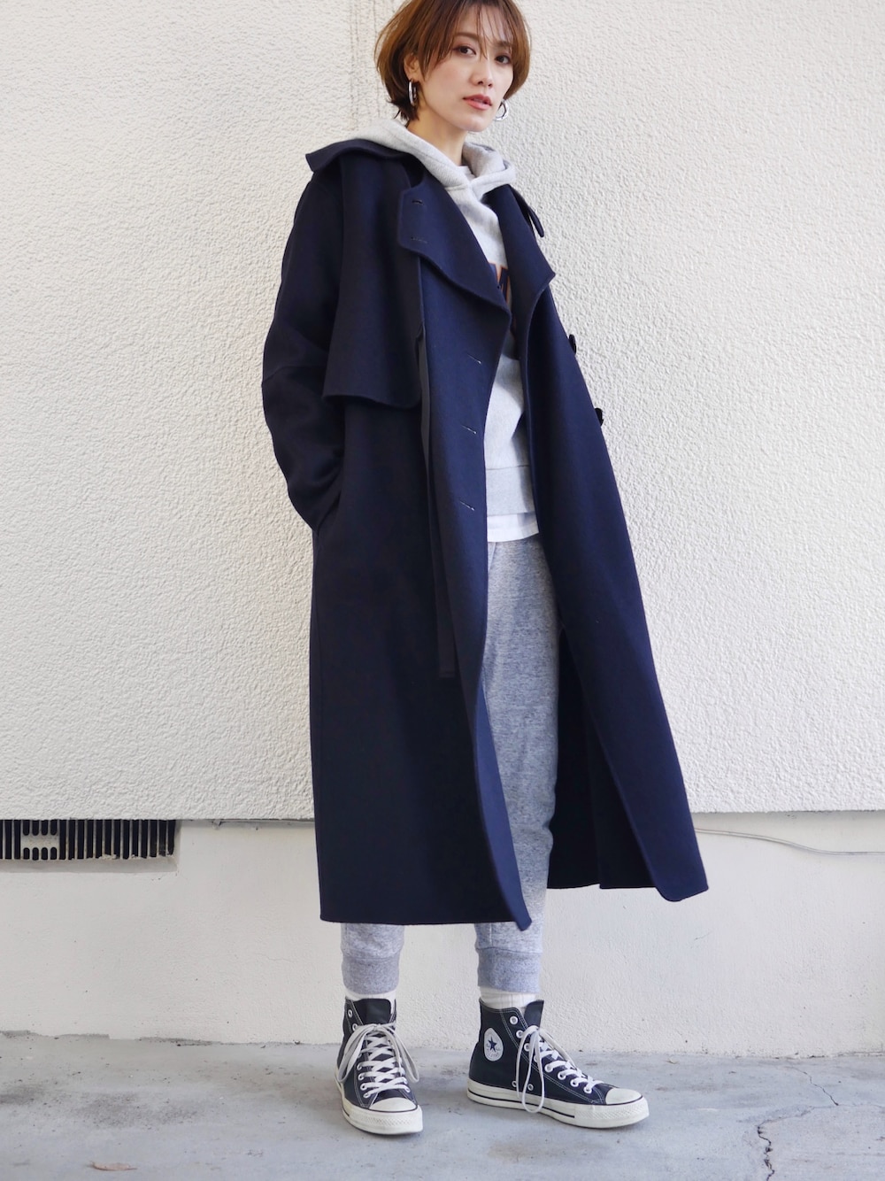 旗当番🧑🏻🌾🚩 上下スウェットもウールコートを羽織ればちょっとそれなりに🤣 parker、pierce…ungrid 👖…ユニクロ(ボアスウェットパンツ 丈長め S) 👜…sea 👟…converse coat…le ciel bleu