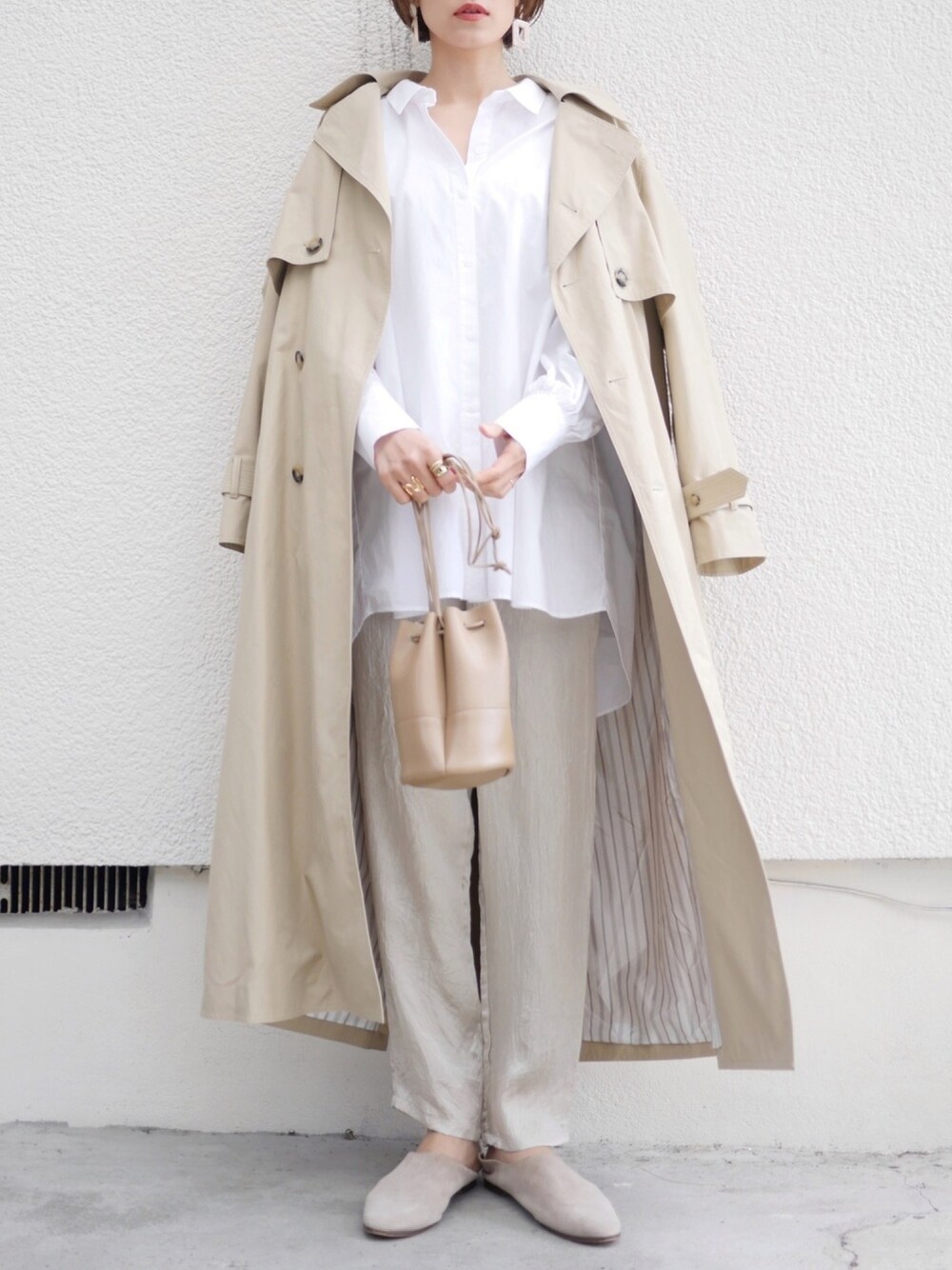 シャツにサテンパンツでオールホワイト🤍 👔、👞…ZARA 👖…une mansion 👜…canal jean 🧥…LAQUINTANE