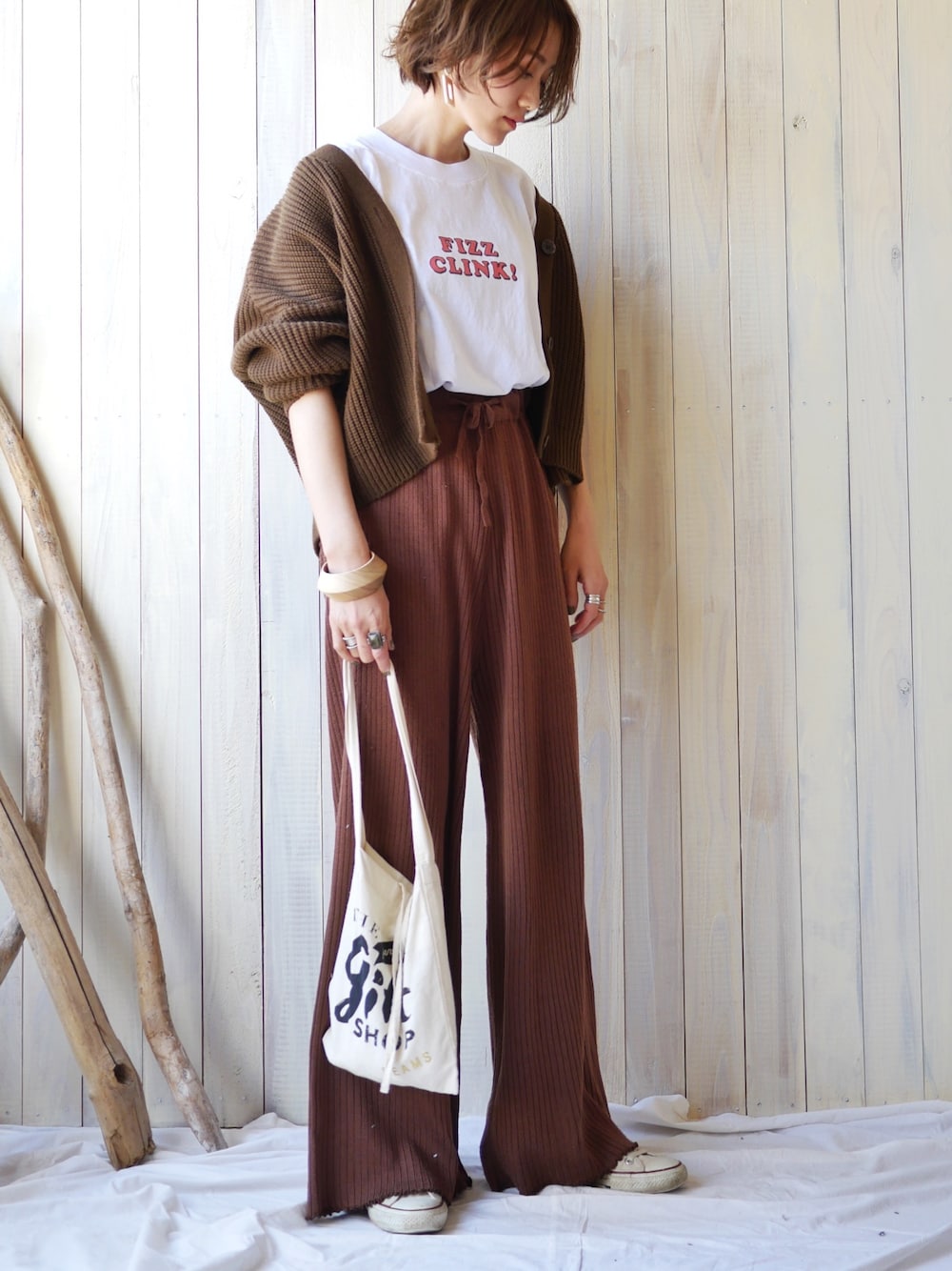 おうちファッションは ニットパンツにTシャツとカーディガンで ラクチンコーデ🐻♨️ 👚…todayful cardigan…studious 👖…merlot 👟…converse