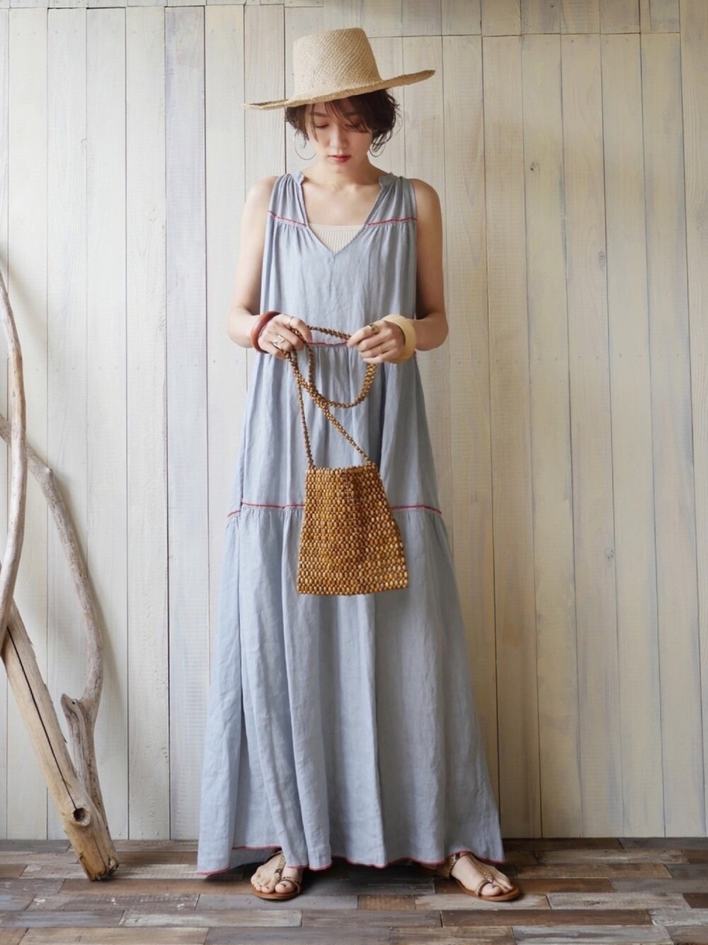 貴重なマキシ丈ワンピース‼️✨ 170センチで引きずれる丈です🤤 ベルトをしてブラウジングしても可愛いので、160センチくらいの方まで着られるのではないかと思います✨ 色は彩度抑えめのくすんだ水色で、切り替えと裾に入っている赤いステッチがめちゃくちゃ可愛い🧵❤️ 素材もリネンなので軽くて涼しいです✨ シンプルに夏っぽい小物を合わせました👒 👗…TCN 🎽…birthday room 👜…PALOMA WOOL(beauty and youth) 👡…ZARA