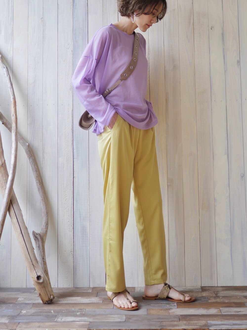 シースルー×サテン💜💛 パープルのシースルートップスはオーバーサイズでゆるく着られる。 長袖でちょっと暑いから、また涼しくなったら沢山着たいなー🥰 👚…ANGIE BY WEGO VINTAGE 👖…ciaopanic 👜…azul by moussy 👡…ZARA pierce…todayful