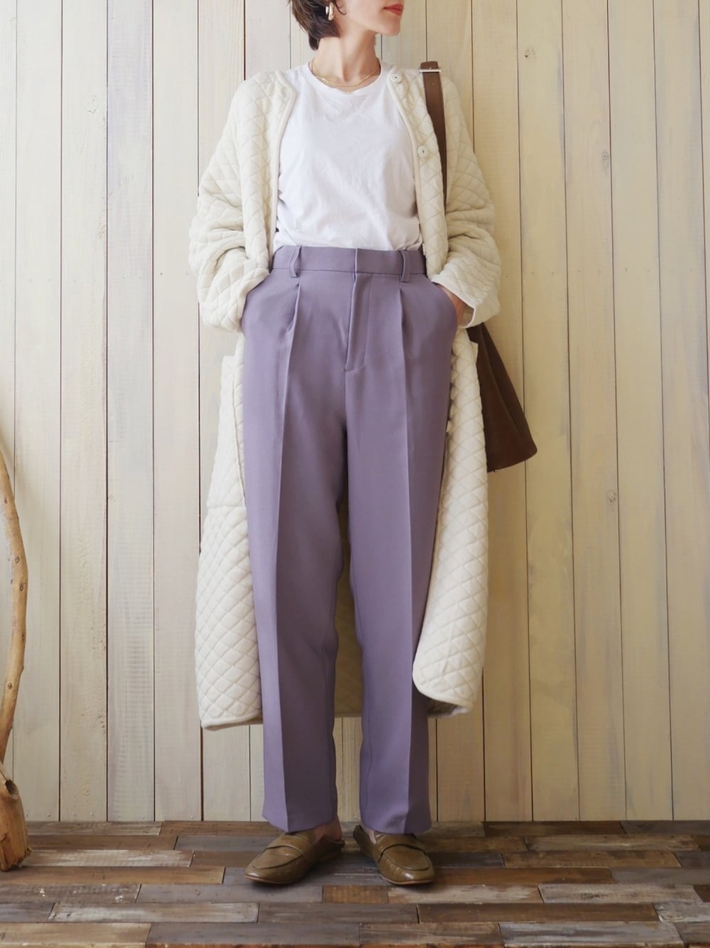 ニットコート🧶 カーディガン感覚で着られます🤍 パープルのパンツはセンタープレスありでスッキリ履けます。 やっとベストなパープルに出会えたかも😳💜 派手すぎず暗すぎず、青味が強すぎず、パステルすぎず笑、落ち着いたパープル👖✨ 生地はそこまで厚手ではないのでロングシーズン履けそう。 丈もわりとあるのでフラットシューズでもブーツでも👍🏼 👚…hanes 👖…Adam et rope 👜…bajolugo 👞…ZARA pierce…kenneth jay lane(cityshop)