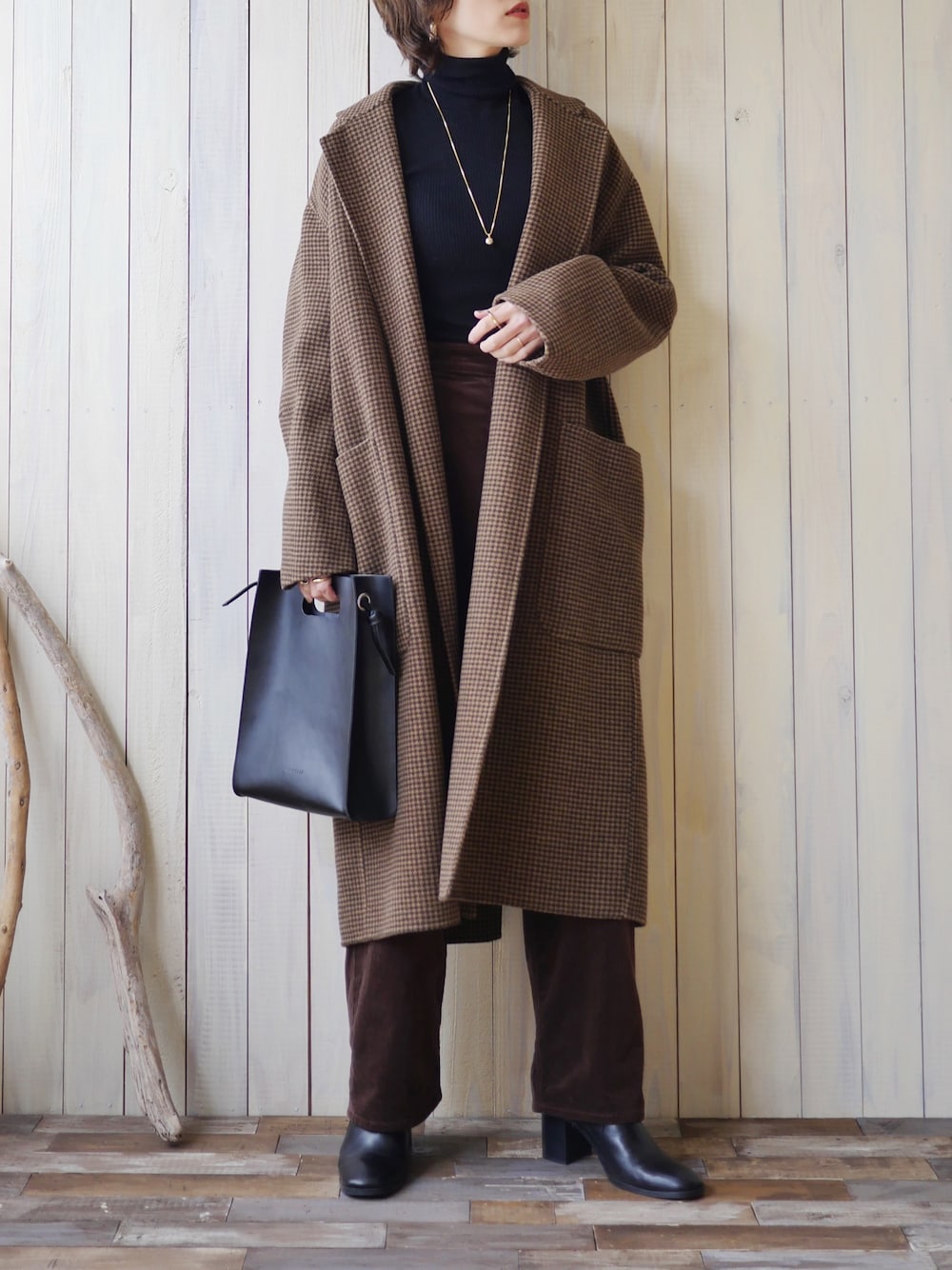 寒かった日のブラック×ブラウン🐻 冬の制服UNIQLOのタートルネックニット☺️ ゴールドのネックレスをポイントに🌟 🧶…ユニクロ 👖…red card 🧥…todayful 👜…the case 👢…ZARA pierce…kenneth jay lane necklace…rin