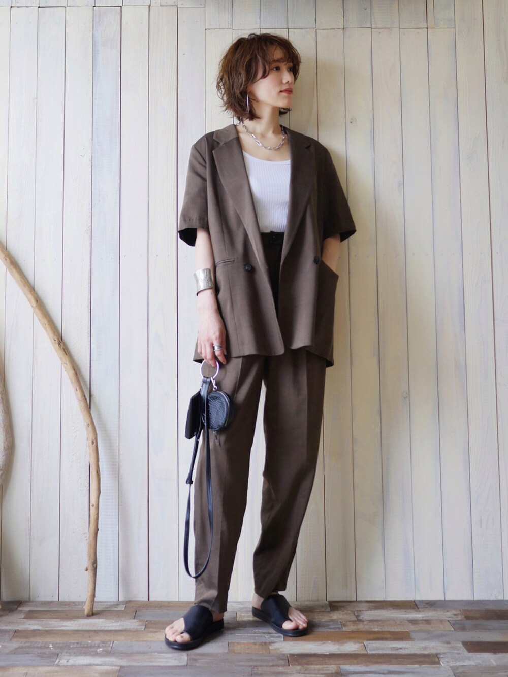ハーフスリーブのセットアップで ブラウン×ブラックのシンプルコーデ🤎🖤 インナーはGUのブラタンク🎽 setup…maison special 👜…vacancy 🩴…lowrys farm necklace…ance pierce…todayful