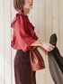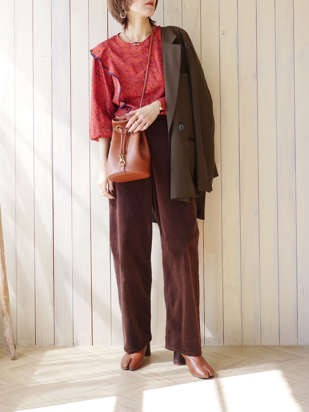 古着にありそうなブラウスにブラウンを合わせてビンテージ感のあるコーデ🎻 jacket…maison special 👚…simplicite 👖…red card 👢…chuclla 👜…lavish gate necklace、bangle、💍…mou