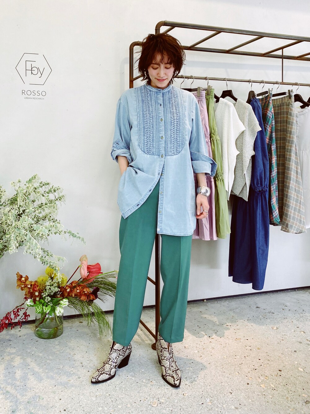 ライトブルーのデニムシャツに綺麗なグリーンのパンツで春色コーデ🌿 袖はラフにまくって😚 👔…something 👖…F by rosso 👢、pierces…ZARA bangle…soierie