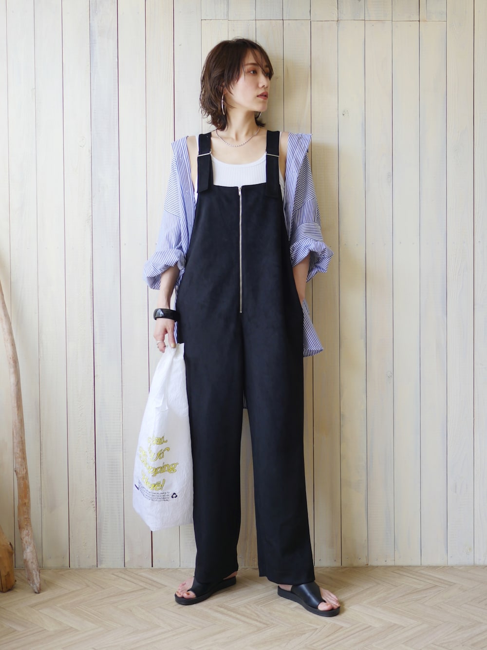 シンプルモノトーンに薄手のストライプシャツを羽織って👔 サロペットも着心地◎ 👔…Chaco closet salopette…marient 🩴…lowrys farm 👜…open editions pierces…todayful necklace…didot showroom 💍…mou