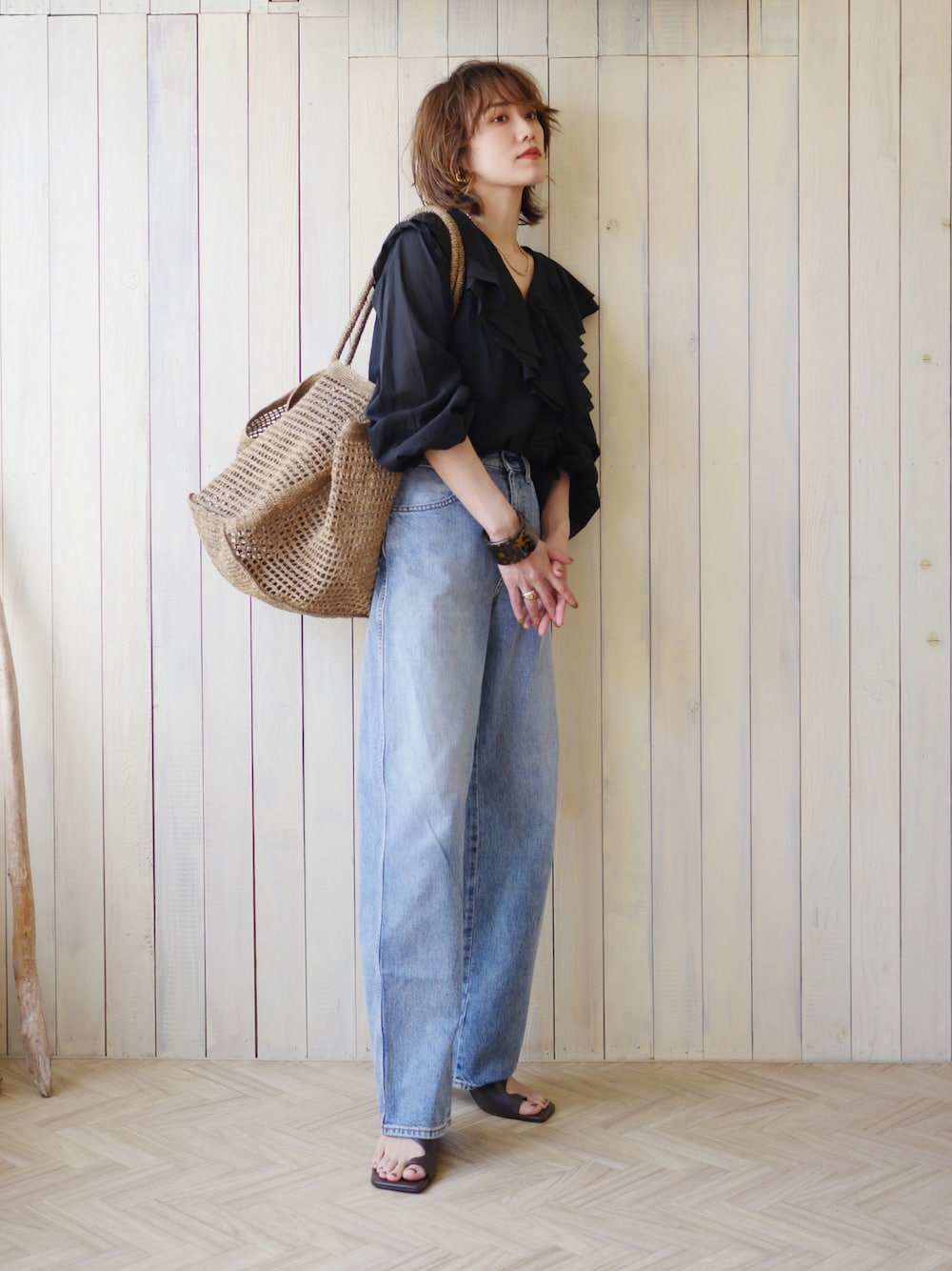 フリルブラウス×デニムの王道甘辛コーデ♡ 👚…whim gazette 👖…ユニクロ 🧺…made in mada 👡…ZARA necklace…didot showroom pierces,💍…mou 💍…cene