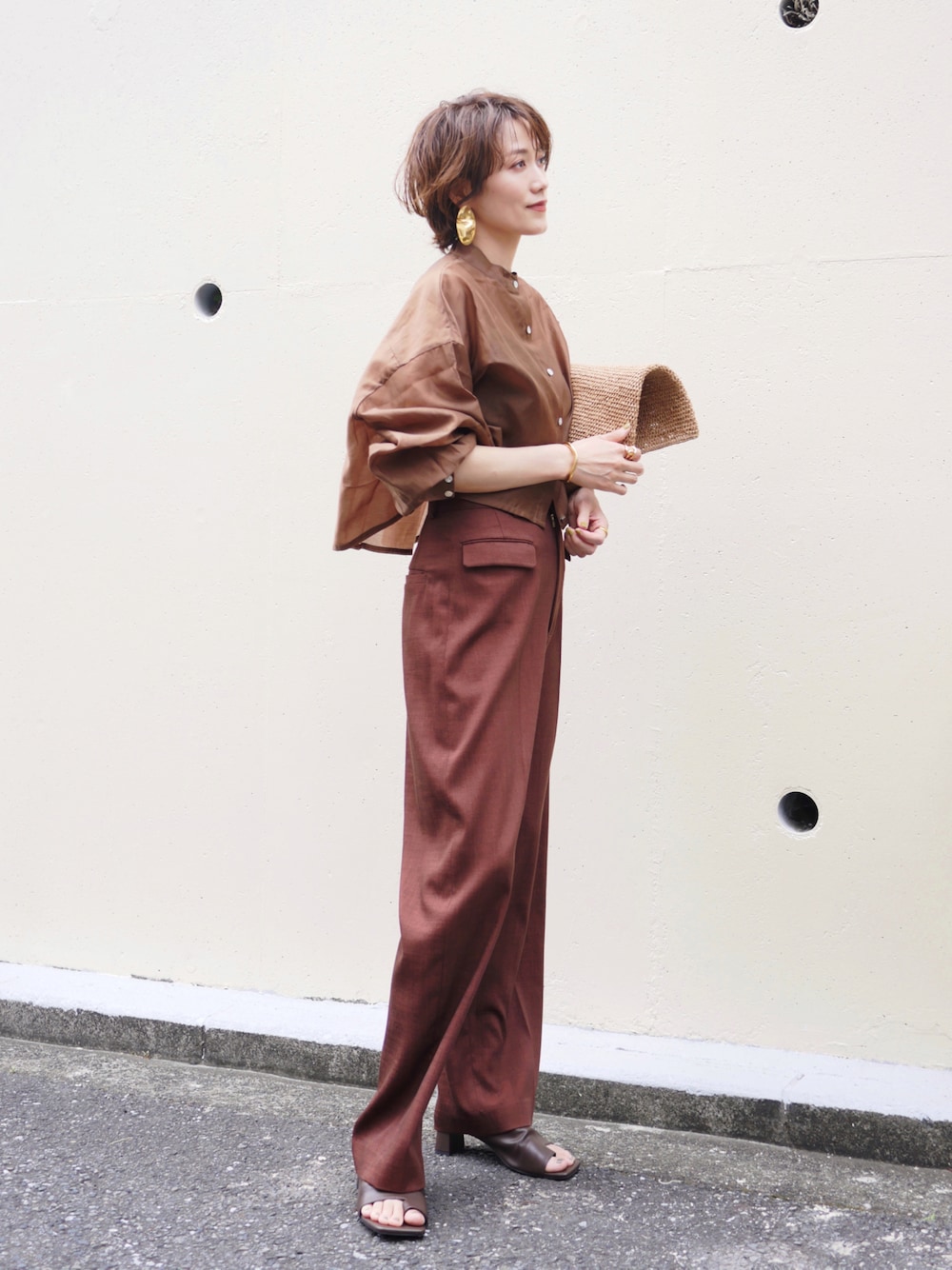 ungridのシアーショートシャツ👔 ワイドスリーブで身幅もワイドでショート丈とのバランスが◎ 長袖だけど風通しいいから夏も大丈夫☺︎ ▫️アイシャドウ ETVOS ミネラルクラッシィシャドー2022CF ビタークチュール ▫️リップはブラウンの上にちょっとテラコッタをプラス ETVOS ミネラルシアーマットルージュ ベイクドブラウン Celvoke ディグニファイドリップス 09 テラコッタ 👔…ungrid 👖…roku 🧺…made in mada 👡…oriental traffic bangle,pierce…todayful ring…cene