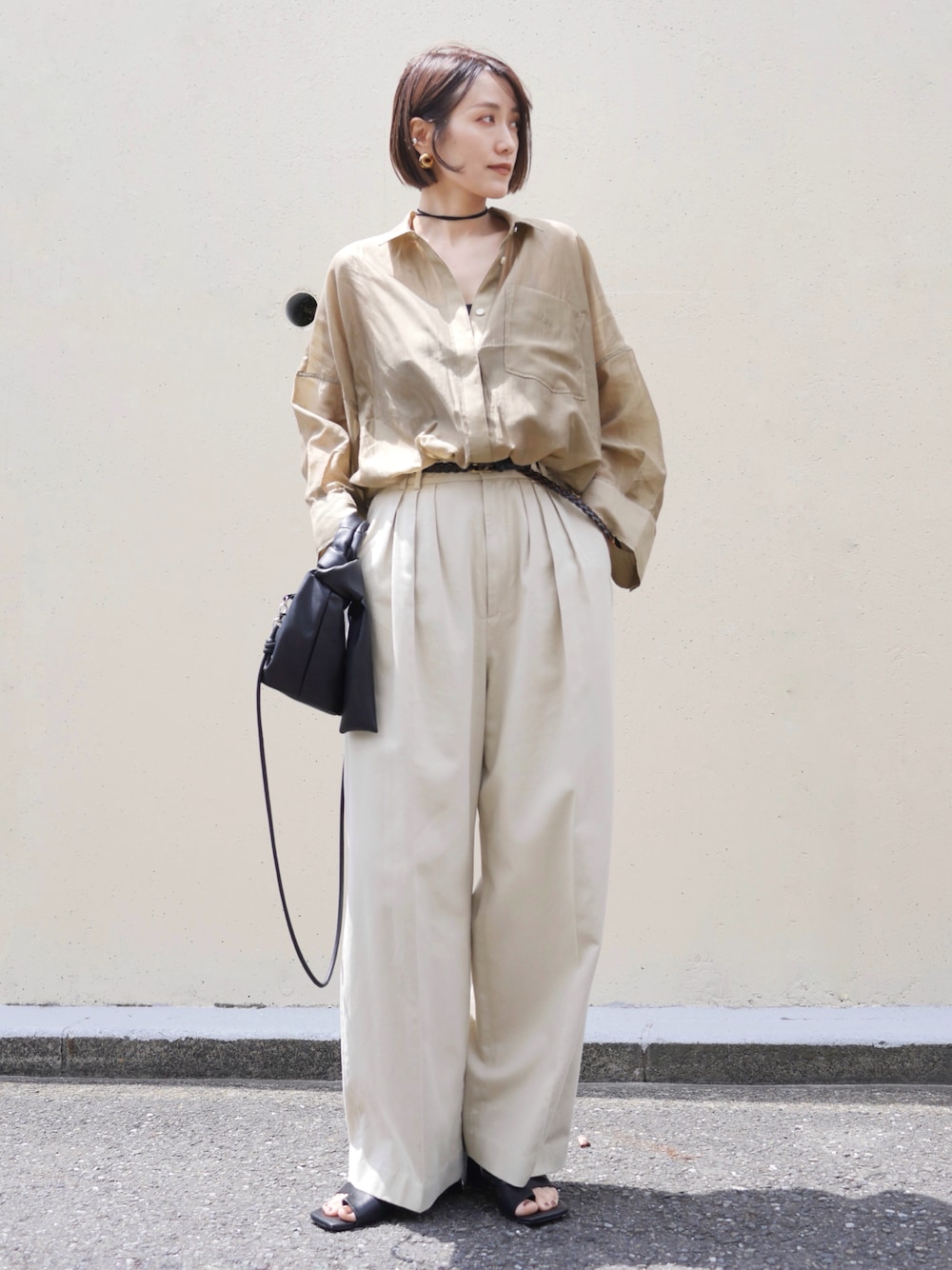 ショート丈のシアーシャツにワイドパンツ🩳 シアーシャツはワイドスリーブで夏まで涼しく着られます☺️ 肩幅もカモフラージュできて着回しもきいて◎ 黒小物で🐦⬛ 👔…gallest 👖…roku 🩴…oriental traffic 👜…fredy emu 🪢…UNIQLO pierce…mou ear cuff…yullum ring…cene