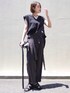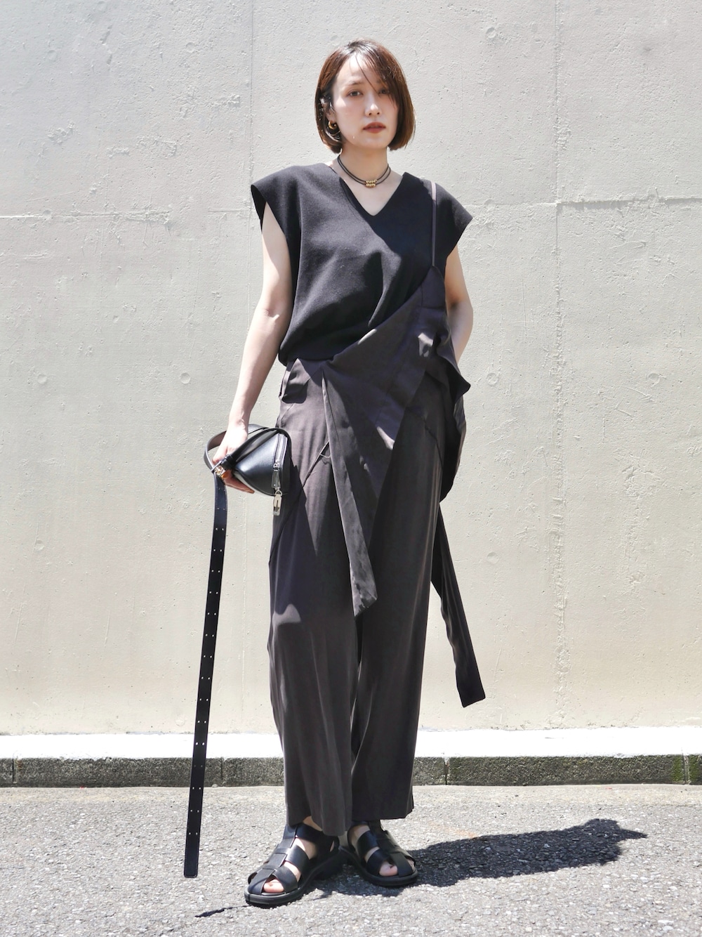 ウエスト部分にシャツが結んであるようなデザインが可愛いトラウザーズ👖 そのまま垂らしてもいいし、肩にかけるとアシンメトリーなデザインのサロペットに♡ 薄手で柔らかい素材で夏も涼しく着られます。 カラーはブラウンなんだけど、ちょっと紫味のあるブラウン🤎 👖…TEROPLAN 🦺…MANOF 👜…add culumn 🩴…Au BUNNISTER choker…lapuis bracelet…abask design pierce,ring…cene