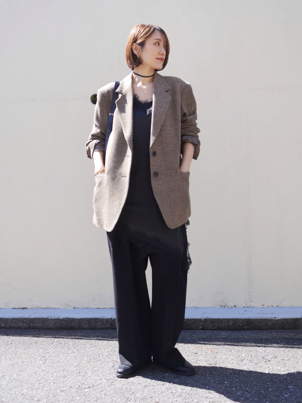 最近よく見かけるレース物🪡 昔よく着てたなぁーと懐かしくなって 黒なら大人っぽく着られる🐦⬛ ピタピタすぎないから着やすいし、肩紐のアジャスターで長さの調節もできてレイヤードにもぴったり♡ one-piece / NOGLE JK / anuke bottoms / todayful bag / add culumn shoes / UNIQLO C choker / goldy pierce,ring / cene