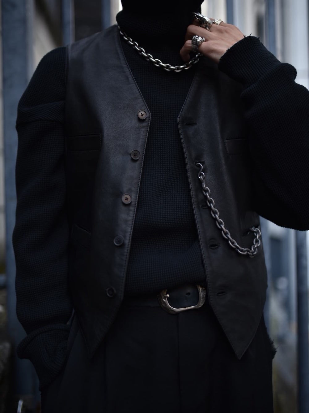 おはようございます。 本日は生憎の天気ですね。 クラッシュのタートルネックにレザーベストのコーデ。 アクセサリーでインパクトをつけてみました。