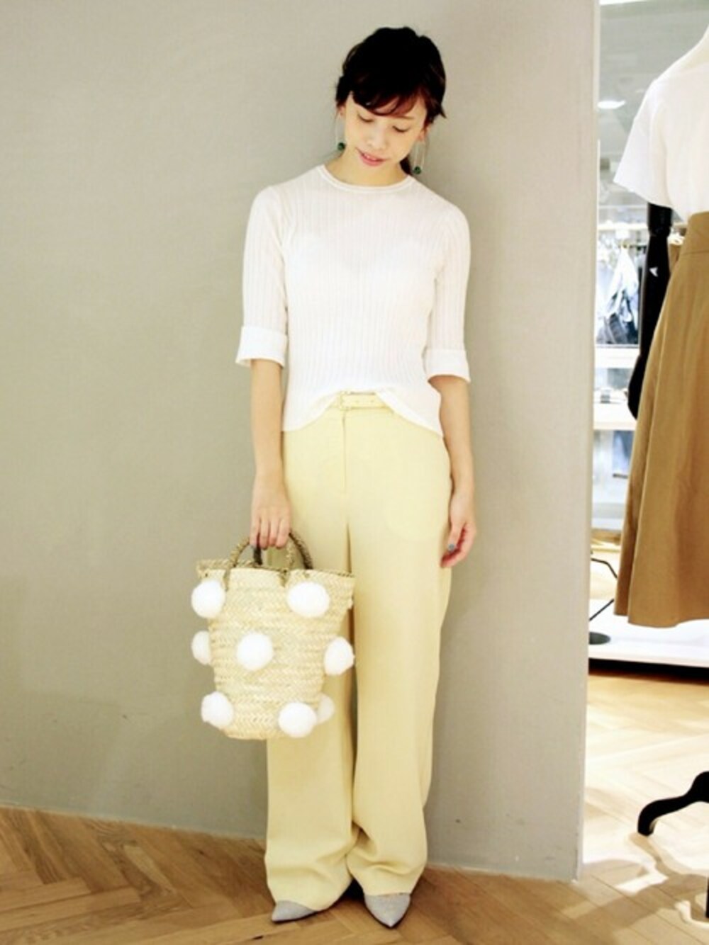 抜群の肌さわりとすっきりとしたシルエットでスタッフにも大人気のワイドリブプルオーバー ボトムスにもとろみのある素材を合わせ女性らしいスタイリングに!