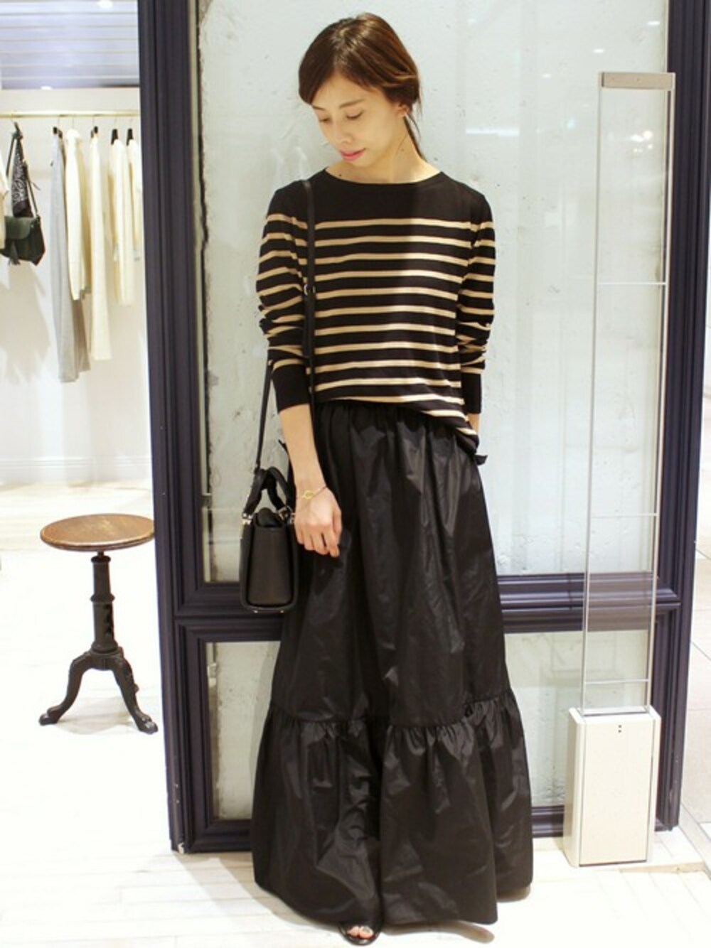 ボーダートップスはいくつあっても便利で活用できます。 柔らかく、目の詰ったコットンで素肌にも着られます。 ロングスカートと合わせてコーディネートしました。