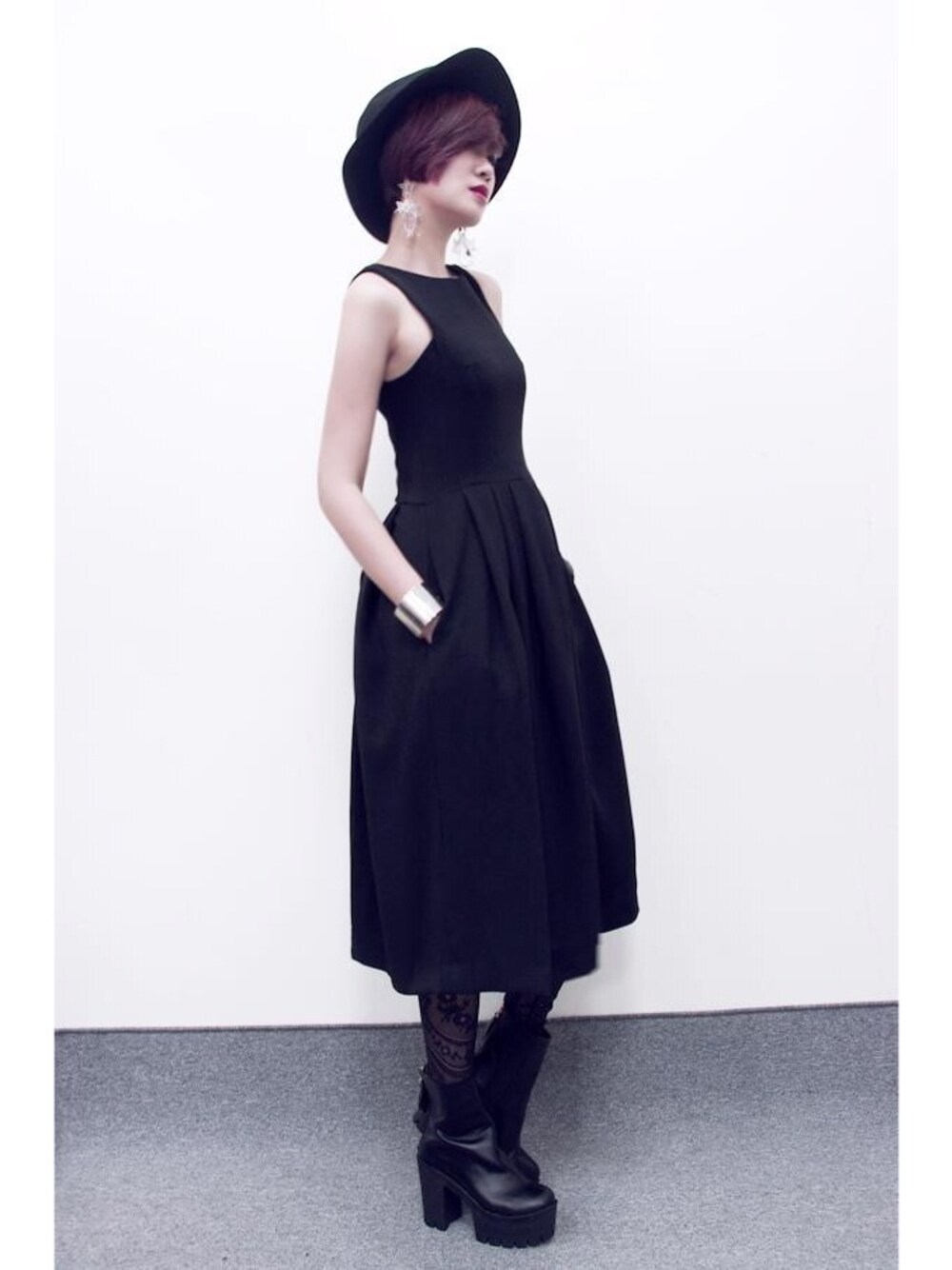 ブラック系のワンピースを着用したレディースの秋コーディネートの1枚目の写真