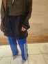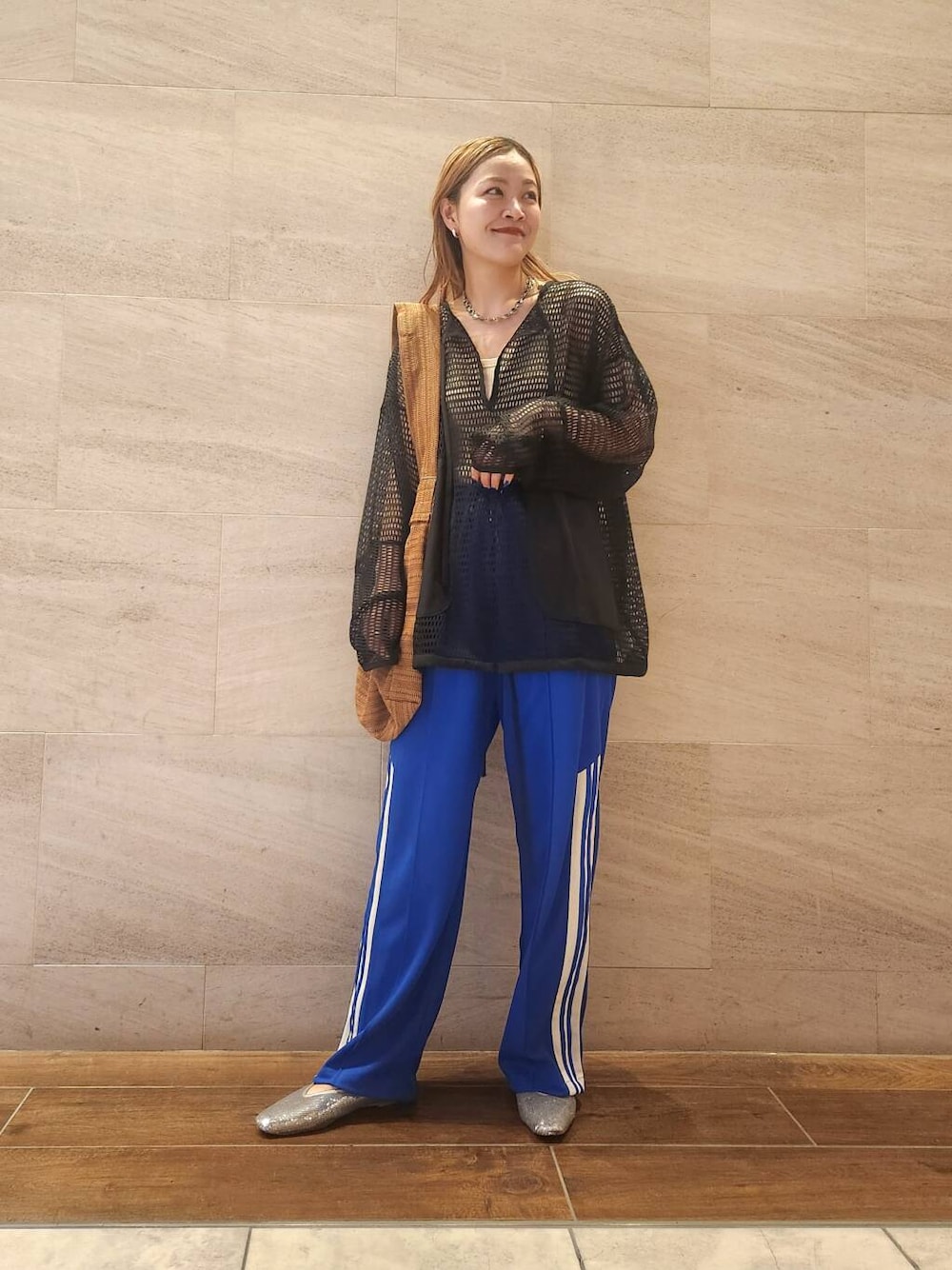 青のラインパンツを差し色に💙 メッシュのトップスをあわせてカジュアルになりすぎないようにしました! 是非、お試しください☺️
