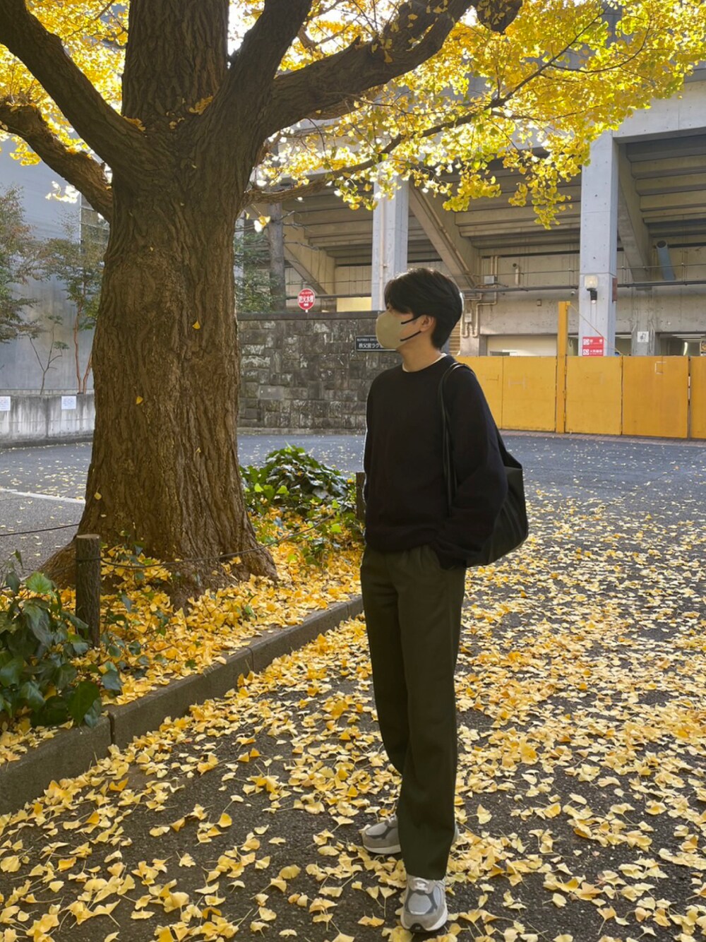 落ち着いた格好が好みなので、 派手な色は使用せず、 靴のグレーをうまく目立たせるよう、 上下ネイビーとグリーンにした。 銀杏並木をたくさん歩くためお気に入りのスニーカーにしました☺︎ こちらはnew balance usa 990 古着屋さんで購入しました! 是非参考にしてみてください!😌