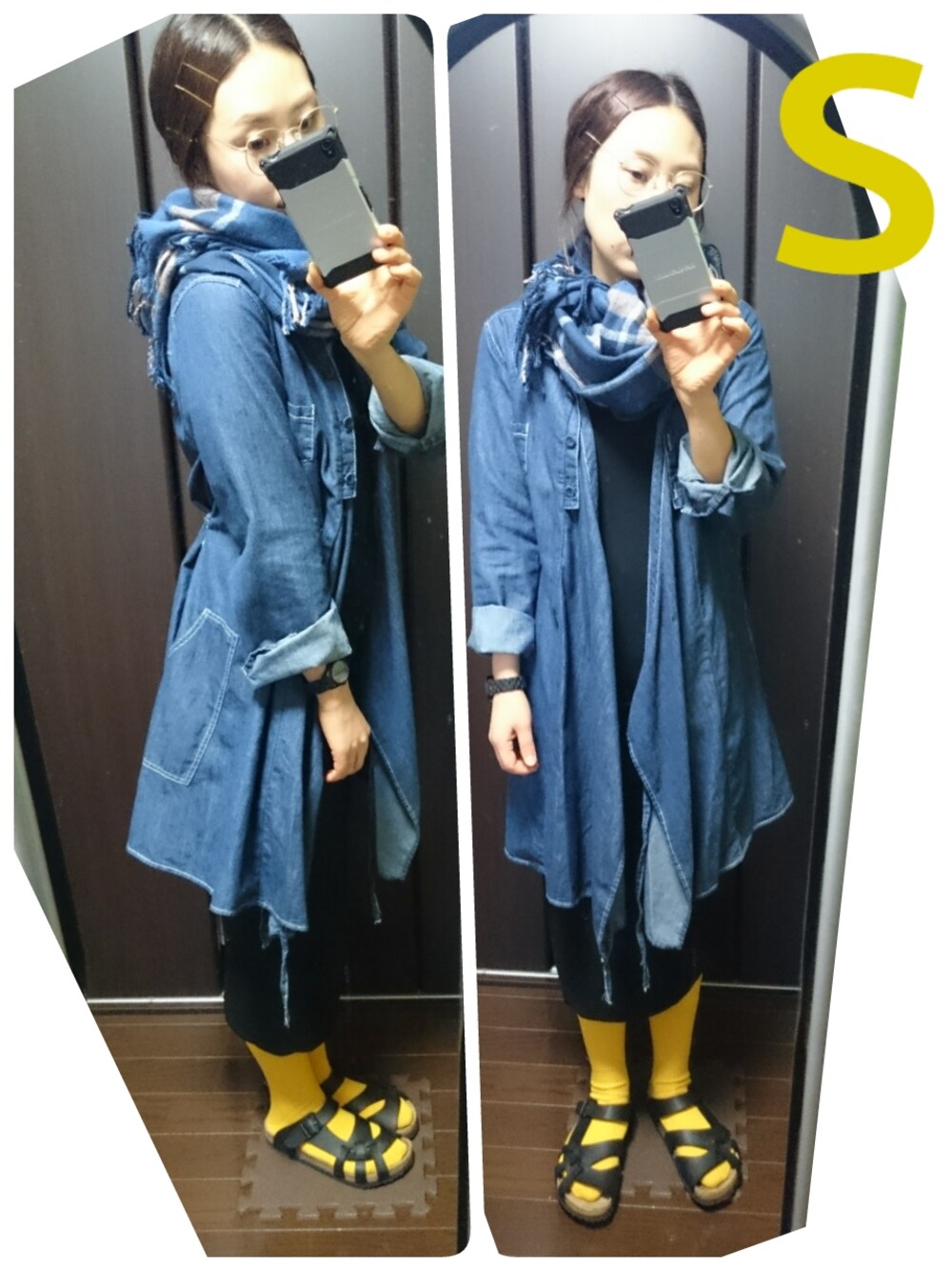 ロングデニムのアウターとチェックのストールぐるぐる巻でゆる~く、黄色のソックスをポイントにビルケンとあわせてみました。