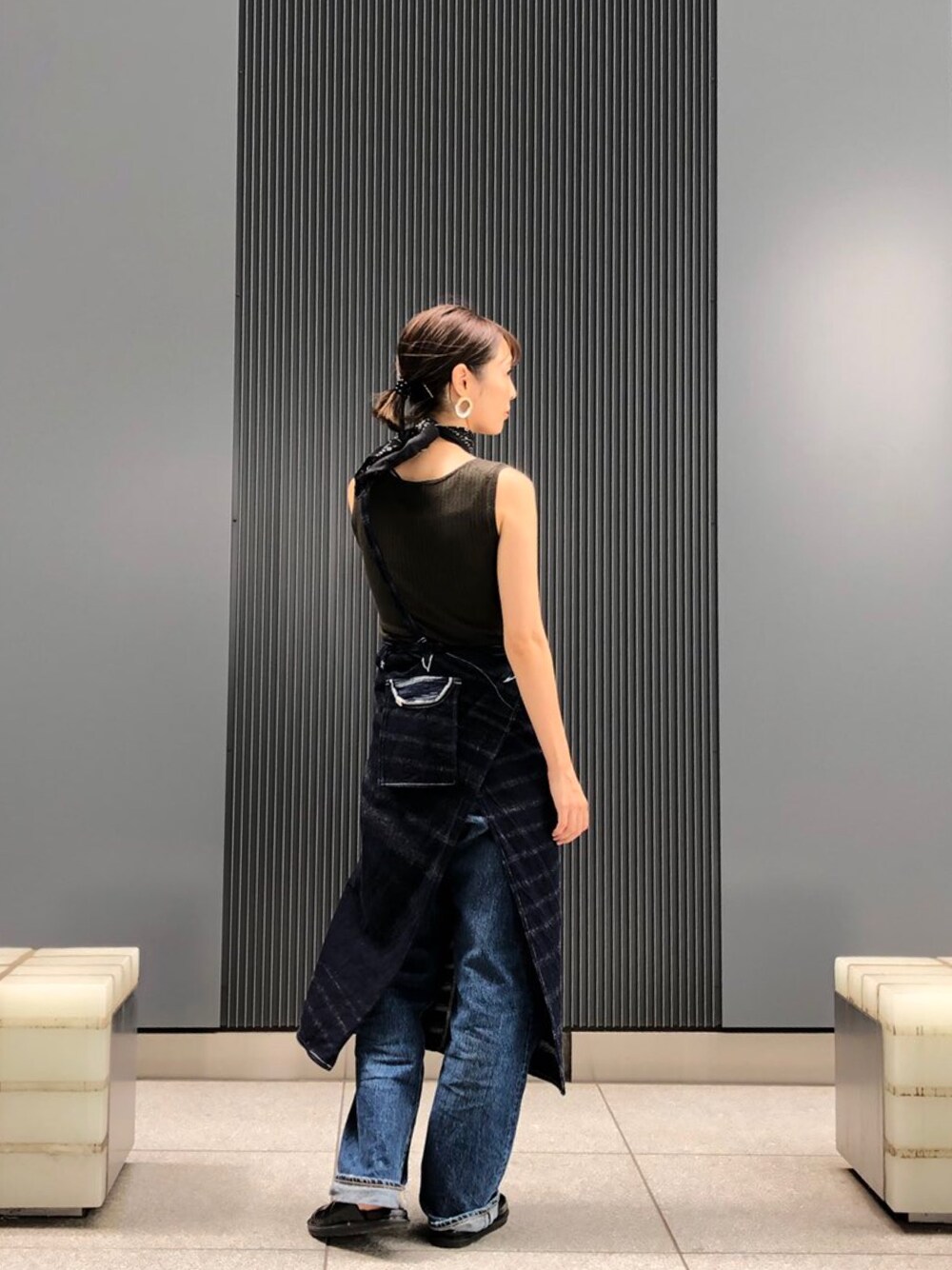 紐の通し方などで着方か何通りかできる tamaki niimeの#deエプ ♡ この日はよく見えないけど、ワンショルダーにしてます 一点ものでお気に入り♩