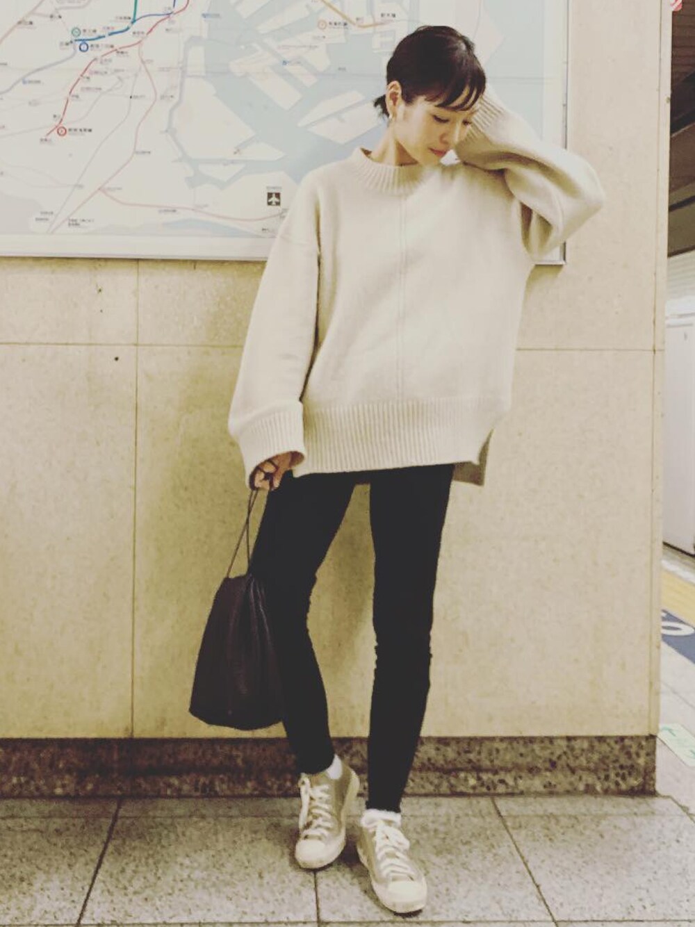 ダボっとしたニットに最近購入したpaisanoのディアスキンの巾着バッグ♡ ポタリーのカラーはサンド*