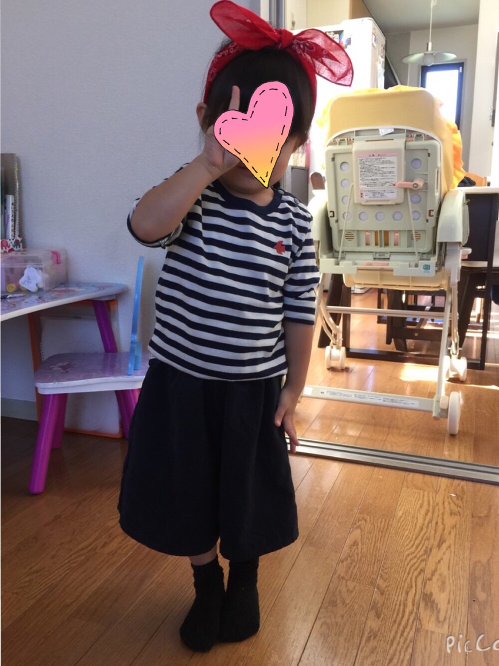 この前のコーディネート(^^) しまむらで子供用ガウチョパンツ見つけて即買い‼︎笑 100センチでまだ少し大きいけどウエスト部分曲げて無理やり履かせてる♡‼︎笑 無印良品で靴下を買ったらサイズが小さかった´д` ;泣