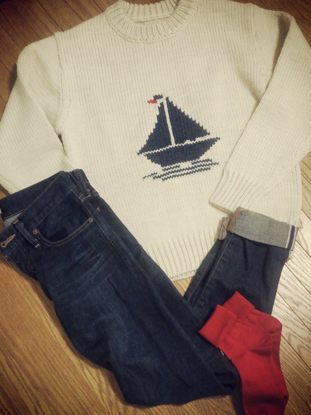 ヨットニットの配色の赤に合わせて、 靴下も赤をチョイスしたのがポイント。