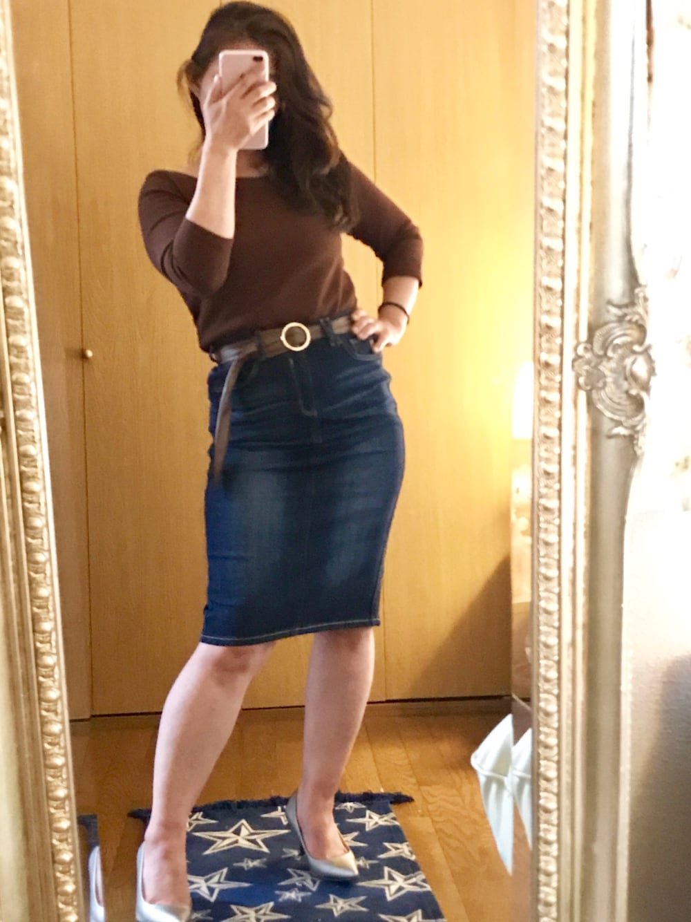 スカートコーデ☆ 子供も産んでから、ジーンズ👖が大好きになって、年中ジーパンばかりでめっきりスカート穿かなくなったけど、超久しぶりにスカート穿いてみました。 こちらのペンシルスカートは、数年前に楽天ポイント使ってタダ同然で購入したサムシングのデニスカ☆ ウエストが大きめに作られていて、腰の部分の布が余るので、ちょっと気に入らなくてそれにスカート穿いて歩く勇気も無くなっていたのでクローゼットの奥にずっと眠っていました。 でも今穿かなきゃ一生穿かないと思って穿いて先ほどコンビニまで行ってきたよ☆ それとパンプスも絶対直ぐに足が痛くなるのでスカート同様、冠婚葬祭や入学式&卒業式以外穿かなかったんだけど、今年はパンプスの気分だったので、パンプスで定評のあるアミアミさんの痛くならない走れるパンプスを買ってみたんだけど、 穿いた瞬間、今まで買ったパンプスのどのパンプスより痛くてショックを受けてたんだけど、こちらもペンシルスカートと一緒に穿いてコンビニへ歩いて行ったら。。。ホントにあまり痛くない💕 試しに走ってみたら。。結構走れる🏃♀️💕 なので今年から、スカート&パンプス、勇気を出して穿く事にしました😊💓 ちなみに若い頃はタイトなミニスカートを好んで穿いていたけど、生足だけは抵抗があって夏でもストッキング穿いてた😂💦 今日は生足☆ もう開き直ってちょっぴり菜々緒ポーズ😂👍✨