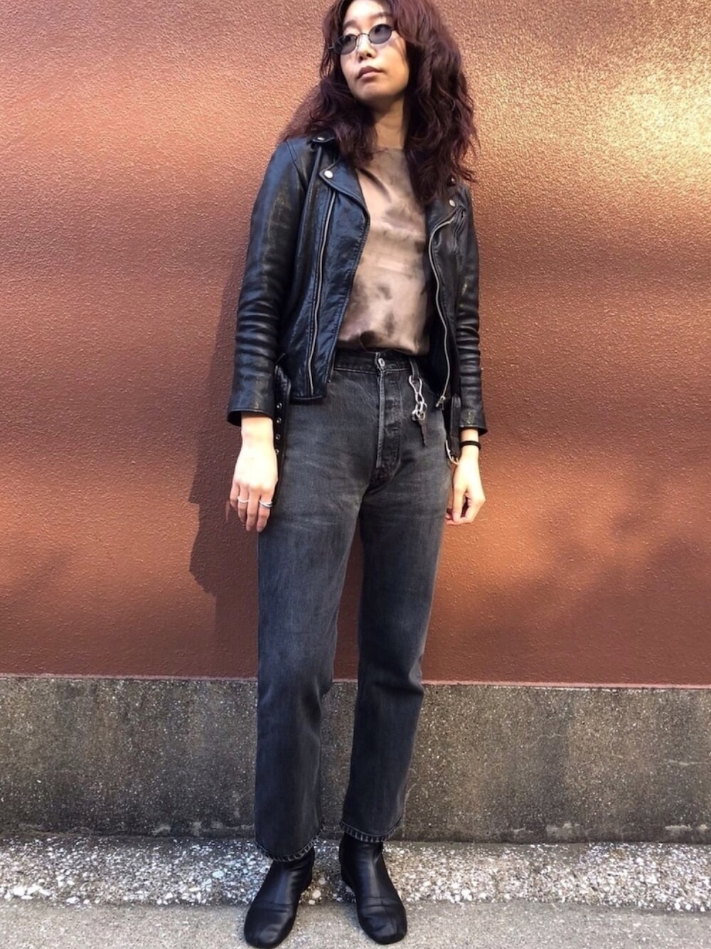 saori.oのライダースジャケット「beautiful people シュリンクレザーライダースジャケット」を使ったコーディネート
