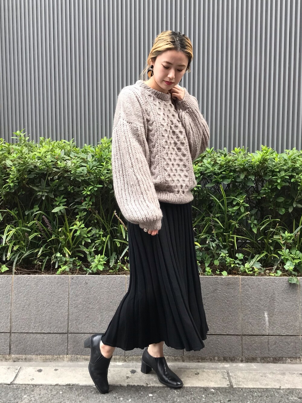 袖のボリュームが可愛いニットとニットプリーツスカート