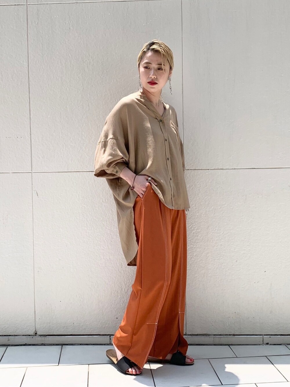 リネン混のビッグシルエットシャツは、後ろ部分の方が着丈長めになります。 合わせたパンツもフロントスリットが可愛い!