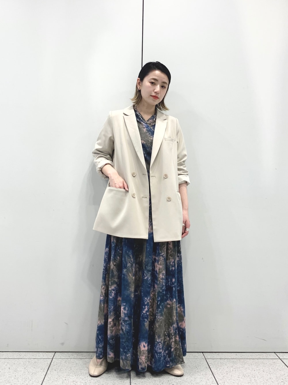 オフホワイトのテーラードジャケット。 春色ですね。 とにかく合わせやすい💯 タイダイのワンピースにさらっと羽織ってみました^ ^
