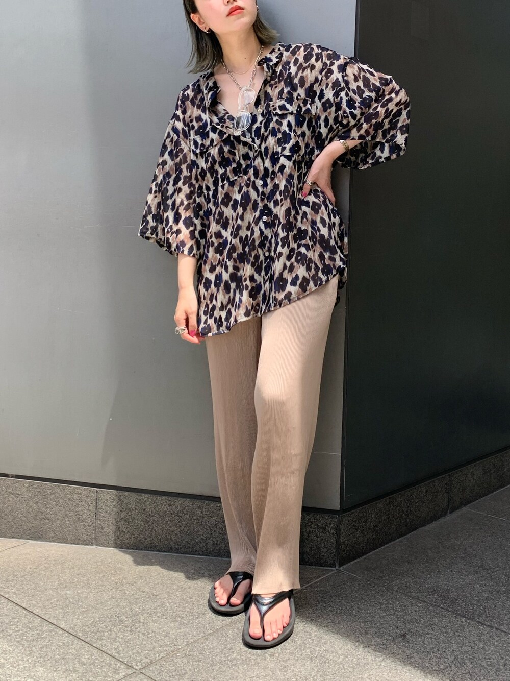 レオパード柄のシアーシャツです。 ビッグシルエットで袖も長めになります。 合わせたパンツはギャザープリーツで伸縮性があります。