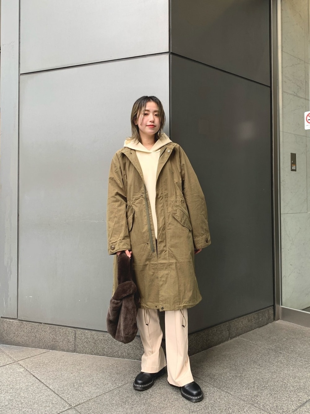 ホワイトのワントーンにメンズライクなモッズコートをがばっと羽織りました。 ▶︎アウター サイズ感:ゆったり着れるサイズ感で、中にビッグシルエットのインナー持ってきてもいけます◎丈は長すぎないので小柄な方でも合わせて頂けますよ。 着心地:軽めの生地なのでアウターは勿論ですがこの上にベストなど重ねてもごわごわし過ぎず着やすいです。ウエストきゅっと絞るとメリハリ出るのでより女性らしくなるのでコーディネートに合わせて変えても。 フードがないタイプで、余計な物を削ぎ落としたシンプルなデザインなので、デイリーにお使い頂けます。 ▶︎パーカー サイズ感:ぴちっとしすぎないジャストです。身幅とアームはゆったりしてるけどリブできゅっとなるので綺麗に着れるパーカーです。 着心地:ハリ感のあるポンチ素材で、ストレッチ性があり、長時間ストレスなく着れます。 シワになりにくく、型崩れを気にせず着られる一味違ったワンランク上のパーカーです。 生地がしっかりしていて、保温性もあり着心地の良い素材です。 パーカーって子供っぽいから、、と悩んでる方にぜひオススメしたいです。 秋冬は特に重宝しやすく、インナーとしても取り入れやすいですよ。 パンツにもスカートにもバランス良く合わせられる程よい丈感で、あまり甘すぎないデザインなので、カジュアルになりがちなスポーティスタイルも大人っぽく着こなすことができます。 ▶︎パンツ サイズ感:フリーサイズです。ぴちっとする感じはないですがやや細身のシルエットです。 着心地: 柔らかく伸縮性のある生地で、ウエストゴムでストレスなく着れます。 バックの裾に施されたジップでシルエットを変えれる、ストレート・フレアの2WAYパンツです。 ツヤのある生地を使用していて、軽やかな履き心地とセンタータックで上品な印象に。 センターに入ったピンタックがすっきりとしたシルエットに。 オーバーサイズのニットを合わせたメリハリの効いた着こなしや、ワンピースとのレイヤードスタイルもおすすめ。 ▶︎バッグ サイズ感:しっかりお荷物を収納できるサイズで、デイリーにお使い頂けます。 ふわふわとしたファーのボリューム感が季節感を演出してくれます。