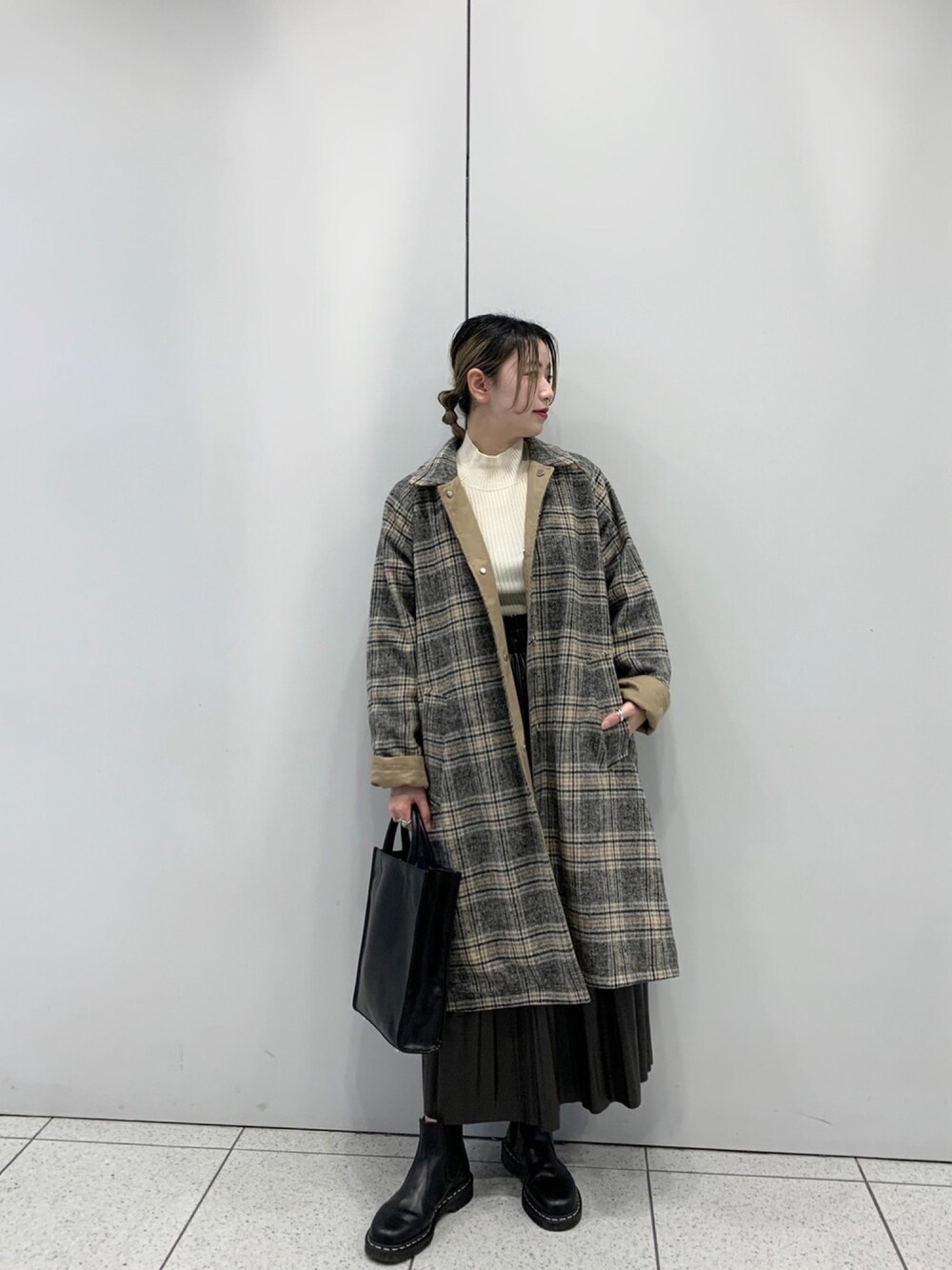 リバーシブルのチェックコートにはフェイクレザーのプリーツスカートで女子感をプラス。 ▶︎ チェック柄リバーシブルステンカラーオーバーコート サイズ感:ゆったり。袖も長めなので一回折ると可愛いですよ。 着心地:しっかりした生地でやや重みはあります。 無地とチェックで雰囲気が変わるので、1枚で2枚分な感覚です◎ ▶︎ ヴィンテージカラーハイネックリブニットプルオーバー サイズ感:タイトなシルエットです。 着心地:肌触りの良い生地なのでちくちくしません。 ▶︎ ポートレートパイピングスクエア2WAYトートバッグ スクエアバッグの中ではあまり他にないサイズ感かと。 小さ過ぎず、大き過ぎず。 取り外し可能なショルダー付きです。