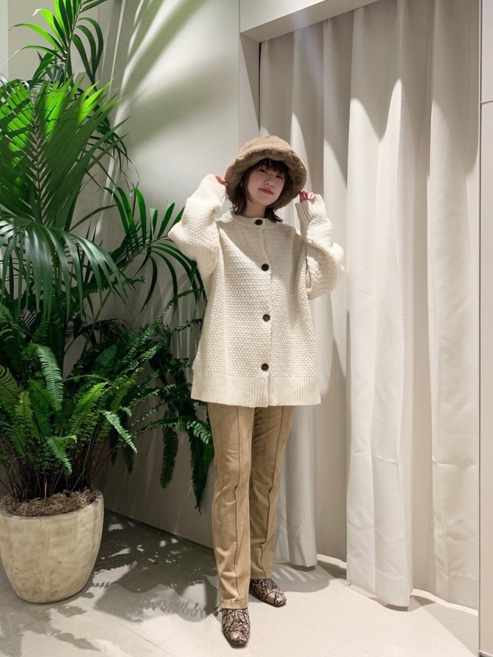 ビッグシルエットのニットカーディガン可愛いのでおすすめ。 色見を合わせてコーディネートしてみました。 ▶︎鹿の子ビッグカーディガン サイズ感:ビッグシルエット。大きめゆったりです。 丈もお尻が隠れる長さです。 着心地:1枚でも勿論、羽織としても、中にインナーをレイヤードしても◎ ポケット付きは嬉しいですね。 ▶︎スウェードライクフレアパンツ サイズ感:膝下から綺麗に広がるフレアパンツです。 太腿周りはぴたっとしますが、ストレッチの効いた生地は履き心地抜群です◎ 着心地:柔らかく肌触り良いです。 とにかく履きやすいので、美脚シルエットでストレスフリーなパンツをお探しの方はぜひ。 ▶︎フェイクファーバケットハット サイズ感: ボリューム感が可愛いファーのバケットハットです。 少し大きめですが、中に調節出来る紐がついてます。