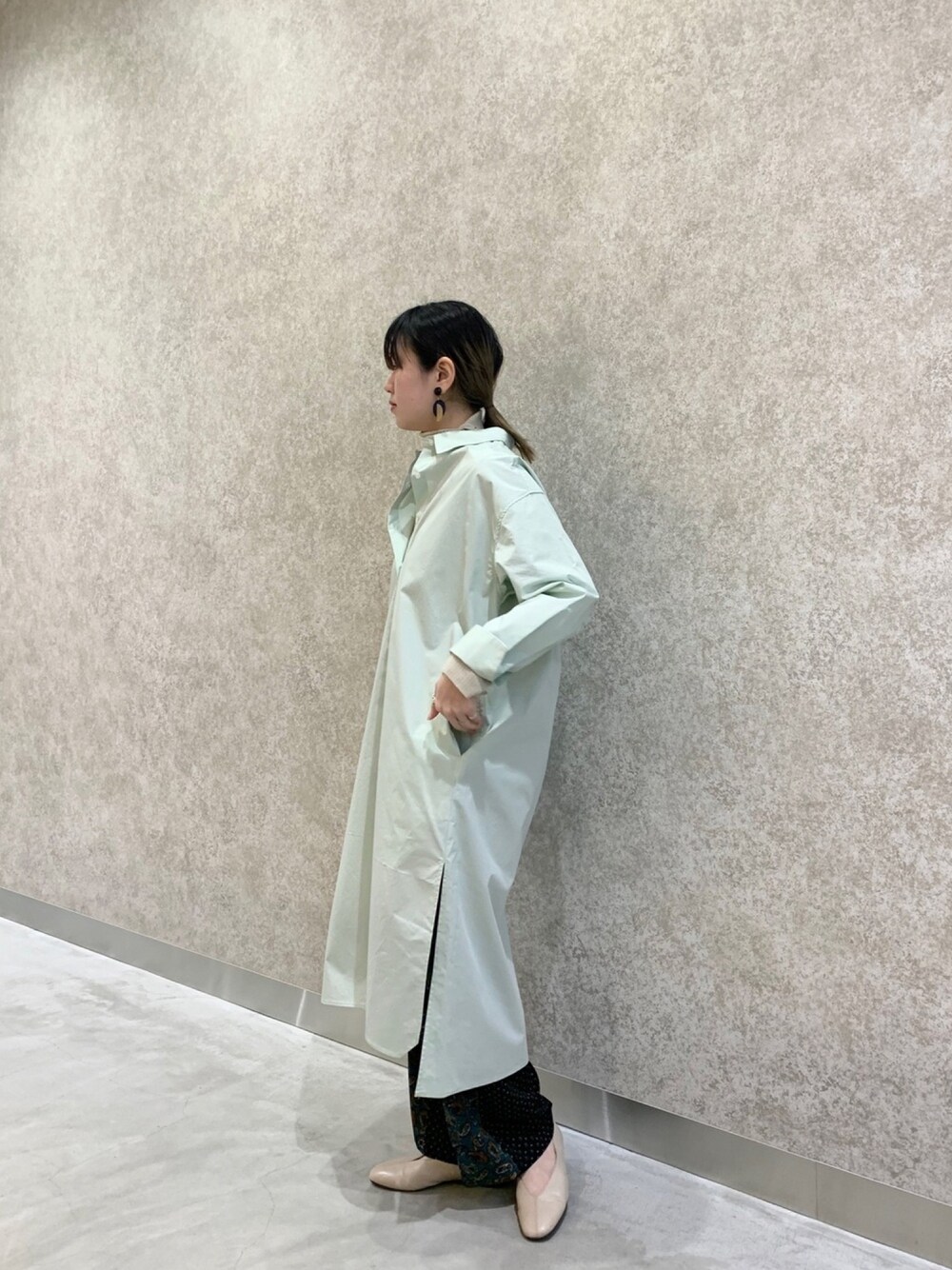春カラーのミントグリーンのシャツワンピースのボトムに柄のパンツでアクセントを。 シャツワンピース 158cmで膝下丈です。 スリットも入っているのでボトムとレイヤードがオススメです。 パンツ 柄の切り替えで珍しいパンツですね。 他ではないデザインなので、人と被りたくない方にはオススメです。