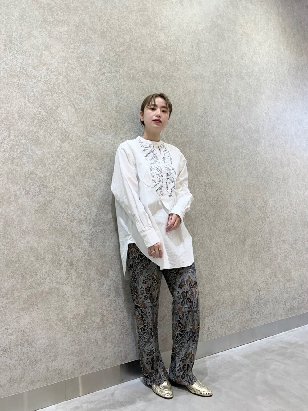 チュニック丈のシャツにてろっと落ち感のあるパンツでリラックススタイル。 ▶︎刺繍ドレスシャツ サイズ感 大きめで着丈もお尻は隠れます。 ボトムを選びやすいチュニック丈ですね。 着心地 ボディラインを拾わないゆったりフォルムで、ストレスのない着心地。 ロングシーズン着回せるコットン素材。 洗いざらしたヴィンテージのような雰囲気の、少しパリッとした素材感が特徴です。 ▶︎ジャガード柄センタープレスパンツ サイズ感 フリーサイズで、ウエストゴムなので楽ちんです。 裾の内側にスリットが入っていて、靴に乗っかって開くので抜け感があります。 着心地 ゆったりワイドなシルエットですが、生地がサラッとしていて落ち感があるので女性らしさも◎ センタープレスのおかげで、リラックス感の中にもきれい目要素がありバランスいいです。