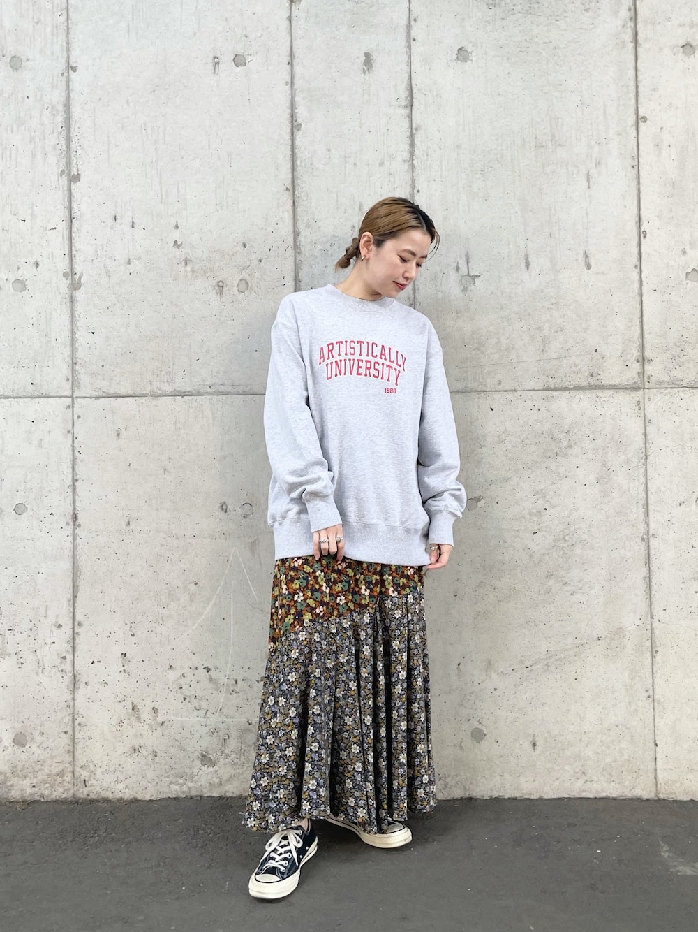 キャミワンピースにビッグシルエットのスウェットをオン。 カジュアルに足元はコンバースで合わせてみました。 ▶︎ カレッジBIGスウェット サイズ感 ビッグシルエットでお尻は隠れる丈感です。 着心地 裏毛なのでさらっとしていて通年通して着やすいです。 袖先もリブがきゅっとしてるのでメリハリあります。 ▶︎ 2トーンフラワーキャミワンピース サイズ感 着丈はストラップで調節可能です。 着心地 さらっと軽い生地でレイヤードもしやすいです。