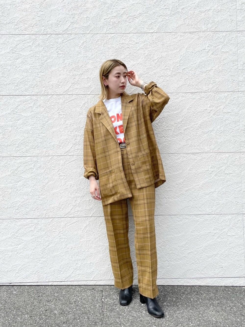 待望のペンドルトン×アッシュ×チャオパニック のセットアップです。 カジュアルにプリントTで。間違いない合わせですね。 ▶︎ 【PENDLETON×H(アッシュ)】別注チェックテーラードジャケット サイズ感:肩落ちデザインでゆったりしてます。 着心地:さらっと軽いのでとても着やすいです。 メッシュのような生地で通気性がいいので暑くなっても着れますね。 夏に着れるJKT最高です◎ ▶︎ 【PENDLETON×H(アッシュ)】別注チェックワイドパンツ サイズ感:158cmでSサイズ着用。 ウエストはベルトしなくても丁度いいですが、ハイウエストできゅっとあげて履きたかったのでベルトしました。 着心地:JKTどうよう軽くて着心地いいです。 パンツは裏地付きなので透ける心配はないです。 ▶︎FUNGTシャツ サイズ感:フリーサイズ。ややタイトでコンパクトなサイズ感です。 着心地:柔らか過ぎないので丁度いいです。