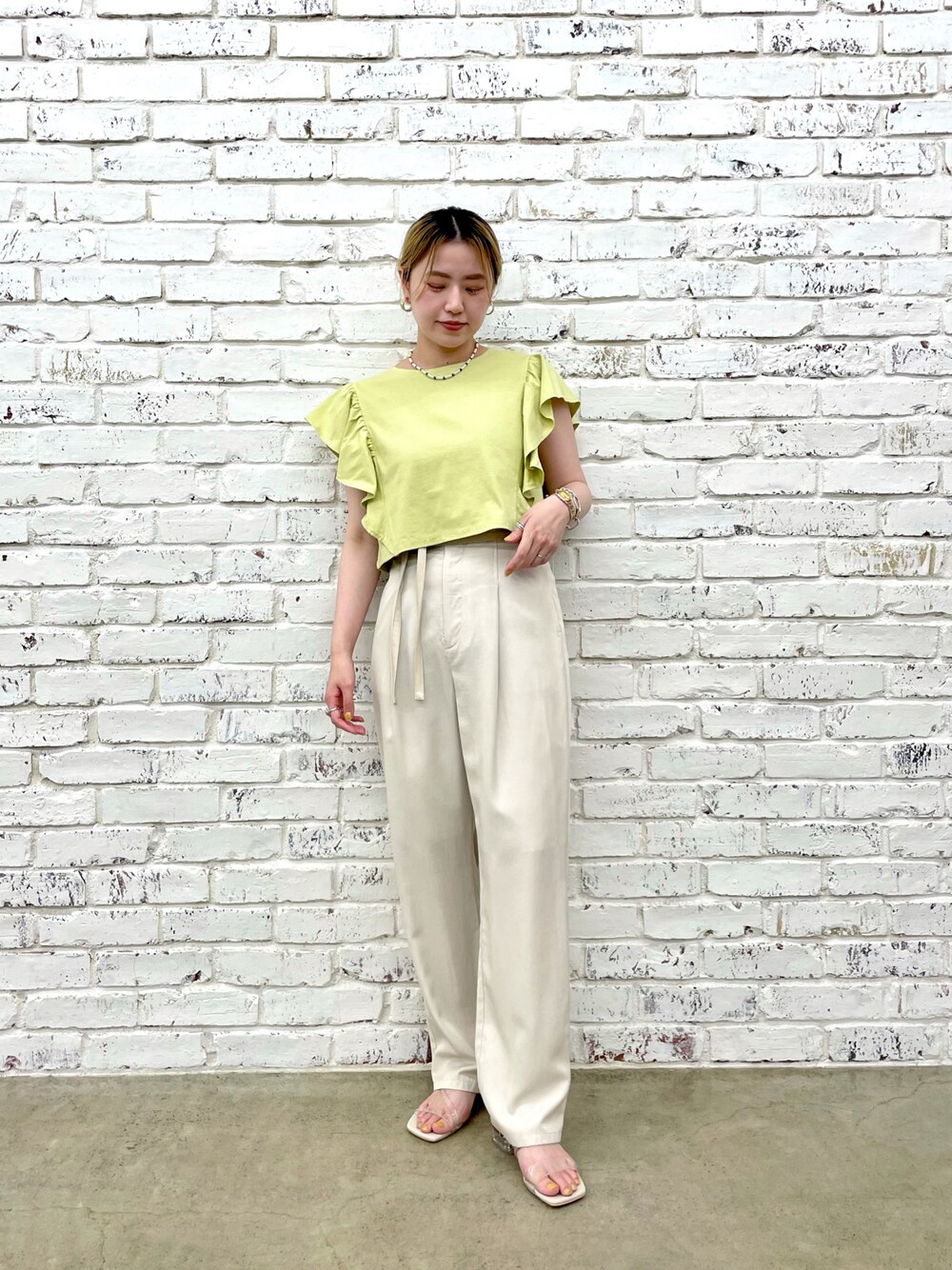 トレンドのショート丈トップスをハイウエストのパンツと合わせて。 トップスはインナー使いでも活躍しそうなデザインで、コーディネートの幅が広がりそうです。 ▶︎ クロップドフリルデザインTシャツ/ショート丈 サイズ感 ノースリーブに大きめのフリルがついた印象です。 肩はフリルで隠れるのでフレンチスリーブくらいの感じです。 ショート丈なのでハイウエストのボトムスやキャミワンピ、サロペットなどのインナー使いもオススメです。 着心地 滑らかな生地なので着心地抜群です◎ カットソーだけどブラウス感覚で楽しめます。 ▶︎ベルテッドサテンパンツ サイズ感 158cmでMサイズ着用。 ウエストはやや細めです。 ハイウエストなのですっきり見えますし、付属の革紐がアクセントになります。 着心地 てろっと落ち感がある生地でとても着心地良いです。 程良くワイドなシルエットなので肌に張り付く感じもありません。