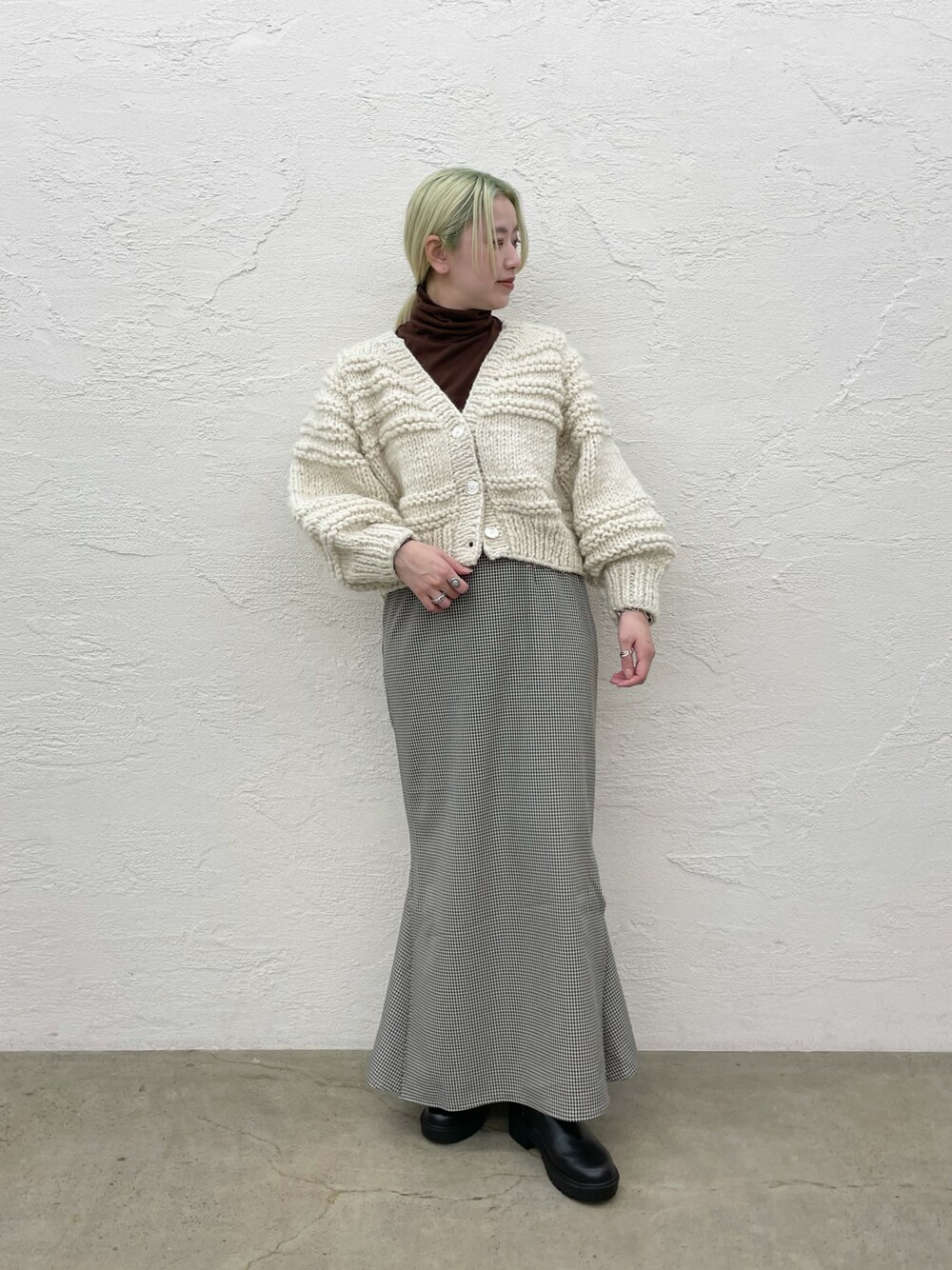 ゆるっとしたボリューム感のあるハンドニットカーデ。 肉厚な生地感が冬のほっこりした感じを演出してくれます。 ▶︎ ハンドニットカーディガン サイズ感 ゆるっとしたサイズ感で袖のボリュームが可愛いデザインニットです。 ボリューム感はありつつも、着丈は短めでコンパクトなサイズ感がまとまりがあります。 着心地 起毛感のある生地で柔らかいです。 しっかり厚手の生地なので軽アウター感覚でも◎ ▶︎ スリットマーメイドスカート/チェック サイズ感 158cmでMサイズ着用。 しっかり長めの着丈で、サイドスリットがより女性らしい印象に。 スリットのおかげで足捌きもいいです◎ 着心地 カジュアルな生地ですがマーメイドシルエットが女性らしさをプラスしてくれます。 裏地が付いているので、透ける心配もありません。