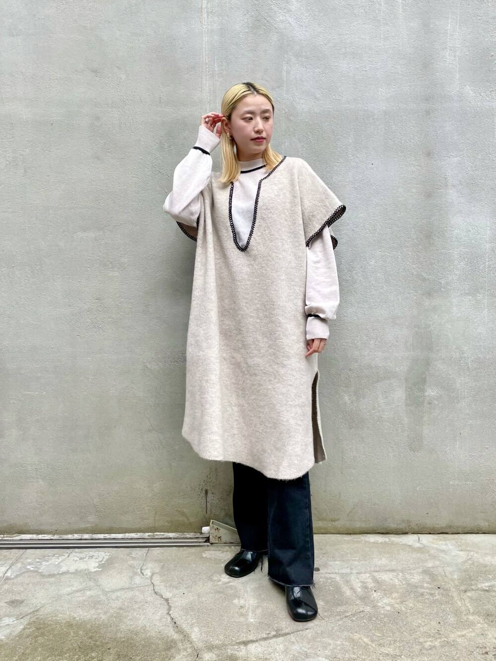 ステッチがポイントのお洒落なセットアイテム。 コーディネートに困った時には重ねてワンピースのように着るのも良し、勿論レイヤードせずに単品使いでも◎ ベストのインナーにタートルネックやバンドカラーシャツなどを合わせても可愛いです。 ▶︎ 【UNSPARE/アンスペア】配色ステッチレイヤードニット/WEB・一部店舗限定 サイズ感 長めのチュニック丈のベストはゆったり大きめでリラックス感があります。 158cmで膝下の丈感です。 大きく開いた胸元のVネックとサイドのスリットで抜け感ばっちり◎ インナーは程良くゆとりがありますが、襟元と袖口のリブできゅっとメリハリがあるデザインで一枚でも様になります。 着心地 どちらの生地もとても柔らかく肌触りが最高にいいです。 ベストはフェルトのような起毛感があり、プルオーバーはチクチクしずらい薄手のニット素材です。 ▶︎ バック切替ハイウエストフレアデニムパンツ サイズ感 158cmでMサイズ着用。 着心地 ついついレイヤードする時とかシンプルなボトムスを合わせたい時に使ってしまう万能デニムです。