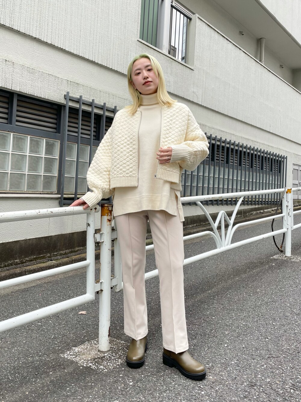 キルティングのニットブルゾンが可愛すぎます! インナーにミラノリブニットを合わせてニット×ニット。 ホワイトのワントーンでコーディネートしてみました^ ^ ▶︎ キルトニットブルゾン サイズ感 ゆったりめのサイズ感で、袖のたぽっとしたボリューム感が可愛いです。 着丈は長過ぎないのですっきり合わせられます。 着心地 程よく肉厚ながらも柔らかい生地です。 チクチクせずもちっとした肌触りで着心地抜群です◎ カーディガンとブルゾンの丁度間のような感じですね。 ▶︎ ミラノリブタートルネックプルオーバー サイズ感 長めの着丈でお尻が丁度隠れます。 身幅もゆったりしてますが落ち感のある生地なのですっきり見えします。 着心地 チクチクしない生地で肌触り良いです。 もちっとしたミラノリブニットは着心地抜群で、一枚でも様になりますしインナー使いでも活躍します。