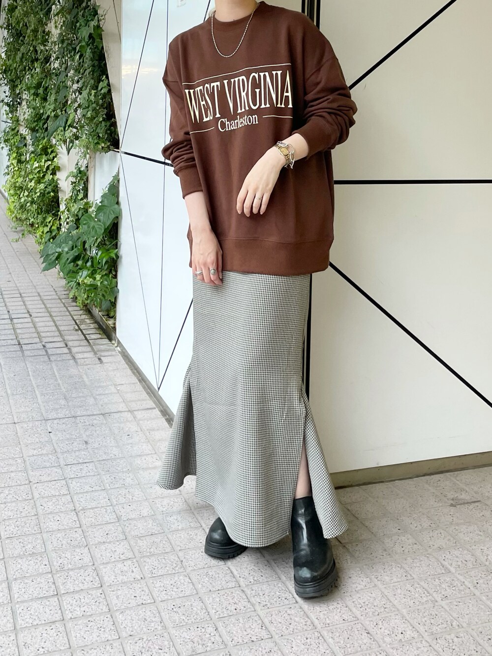マーメイドスカートにビッグスウェットの鉄板コーデ◎ スウェットはWEB限定アイテムです^ ^ ▶︎ロゴビッグスウェット サイズ感 158cmでお尻がすっぽり隠れるゆったりめのサイズ感です。 身幅はややすっきりしているのでバランスは取りやすいです◎ 着心地 さらっとした裏毛で重たくなくとても着やすいです。 ▶︎スリットマーメイドスカート サイズ感 Mサイズ着用。 ウエストは後ろゴムになっているのでリラックス感があります。 マーメイドシルエットですがタイト過ぎないので履きやすいです。 着心地 さらっとしていて通年で履きやすい生地感です。 サイドスリットで歩いた時にチラッと見える足元が女性らしさも◎