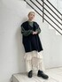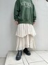 WEB限定のロゴスウェットにジレを重ねて。 ボトムスは甘めのティアードスカートで女性らしさを出してみました。 ▶︎ウール混ジレジャケット サイズ感 裏表で生地が違うバイカラーのジレ。 ゆとりのあるサイズ感なのでレイヤードもしやすいです。 ウール混ですがてろっと落ち感のある柔らかい生地なのでシルエットも大きく見えにくいです。 着心地 柔らかく軽い作りで保温性もあるので、重ね方次第でロングシーズンお使い頂けます。 秋には薄手のニットやロンTと合わせて、冬にはインナーダウンなどアウターの上に重ねたりと幅広く活躍してくれます。 ▶︎ ロゴビッグスウェット/WEB限定 サイズ感 全体的にゆったりとしたチュニック丈です。 程よくゆとりのあるサイズ感ですが、首元はしっかり詰まっていたり袖口のリブもしっかりきゅっとなるのでメリハリがあります◎ 着心地 柔らかく肌触りの良い生地感です。 厚すぎない裏毛なので、重ねたいインナーも選ばずにコーディネートの幅が広がります。 古着っぽさのあるカラー展開も魅力的です◎ ▶︎ サテンティアードマキシスカート サイズ感 158cmで足首隠れる長さです。 ウエストはゴムでリラックス感もあります。 段々になっているフリルデザインは落ち感のある生地なので、広がって見えずすっきり見えます。 着心地 ふわっと軽い薄手の生地で、歩くたびに揺れるフリルデザインが女性らしい印象に。