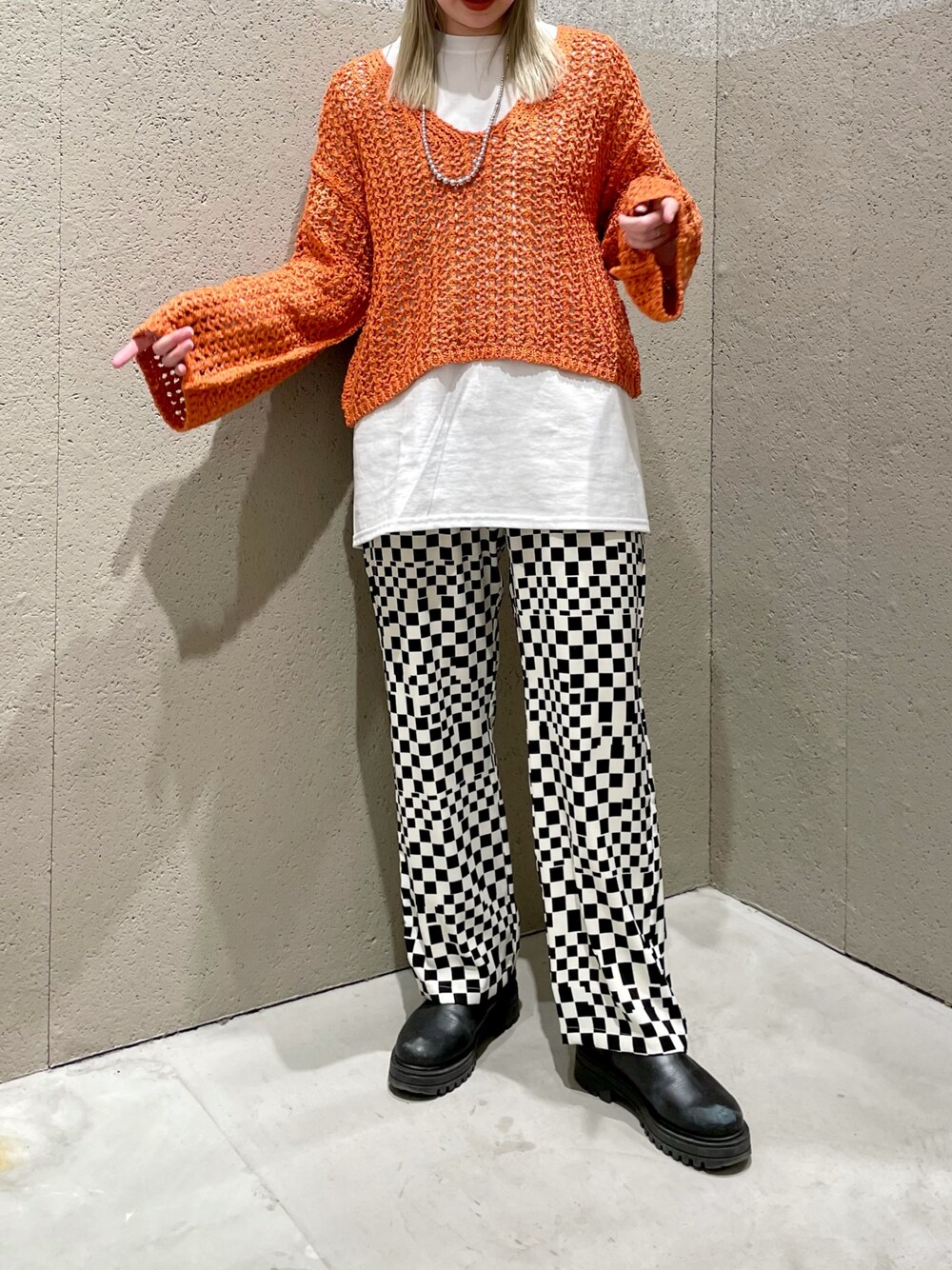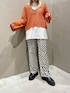 ざっくりとした編み目のニットは通年通して着れるのでコーディネートを考えるのが楽しいアイテムです^ ^ トレンドのチェッカーのパンツで大人カジュアルに。 ▶︎ 透かし編みショートニットプルオーバー サイズ感 ざっくり編みでゆるっとしていてレイヤードがしやすいサイズ感です。 トレンドのショート丈なのでバランスも取りやすいですよ。 着心地 生地自体はしっかりしています。 チクチクしない肌触りの良い生地で、今はシャツやロンT、夏はタンクトップやキャミソールなどと合わせても◎ 合わせるインナー次第でシーズンレスで着用して頂けます。 ▶︎ 【ALORE(アローレ)】ロンTee サイズ感 程良くゆとりがあり、着丈はお尻が隠れる長さです。 首元も開きすぎていないのでカジュアルに合わせて頂けます。 着心地 さらっとした薄手の生地感で、一枚では勿論レイヤードもしやすいです。 カラバリも豊富なので、何枚持ってても間違い無しのスタメンアイテムです◎ ▶︎ 総柄ワイドイージーパンツ サイズ感 ウエストはゴムで絞りの紐も付いています。 ゆったりしたワイドパンツですがてろっと落ち感のある生地で綺麗に見せてくれます。 着心地 肌触りの滑らかな生地感でシワになりにくいです◎ 少し光沢感があるのもカジュアル過ぎずに合わせられます。 ウエストゴムでリラックスして穿いていただけるのも嬉しいポイントです。