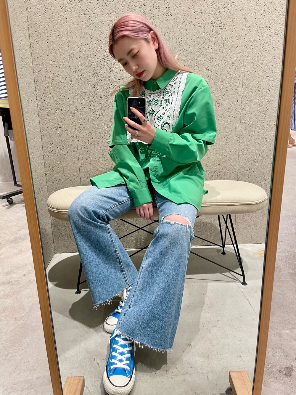 カラーシャツに王道デニムで。 ビビッドなカラーリングで気分も上がります子♪ ▶︎2wayシャツ サイズ感 ビッグシルエットなのでレイヤードも楽しめるサイズ感です。 着丈もお尻が隠れる長さで安心感があります。 袖がボタンで着け外し出来るのでオールシーズン着用可能です◎ 着心地 さらっと軽い着心地で、夏場も快適に過ごせそうです◎ 肘部分だけボタン外してちらっと見せると可愛いですよ! ▶︎ローラス サイズ感 26のサイズ着用です。 広がり過ぎないフレアシルエットが美脚効果抜群です◎ 着丈は158cmで靴にワンクッション乗ります。 着心地 柔らかくとても履き心地の良いデニム。 しっかりした生地感で長く愛用して頂けます。 ▶︎付け襟 前後2wayの付け襟です。 リボンを前にしても可愛いですよ◎ いつものお洋服にプラスするだけでコーディネートが華やかになります。