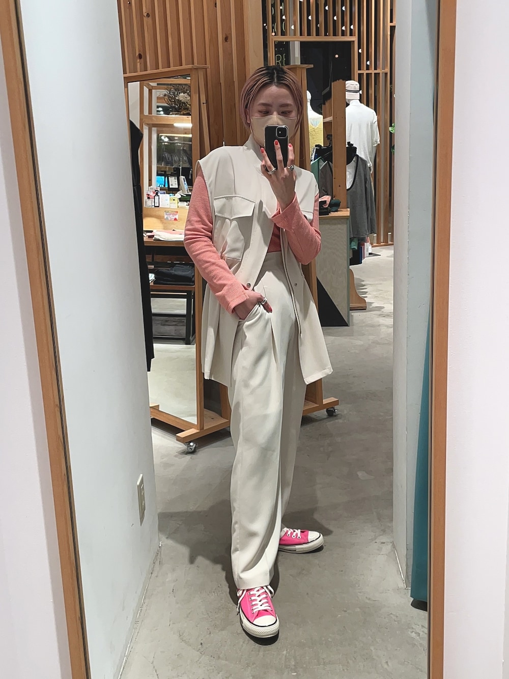 ベストのセットアップ。 インナー変えれば通年着れちゃいます◎ ▶︎ミリタリーベスト サイズ感 ウエストが絞れるようになっていてサイズ調整可能です。 きゅっと絞るとスッキリ見えます◎ アームホールは広めなのでレイヤードもしやすいです。 着心地 さらっと、少してろっとしていて落ち感があります。 カジュアルになり過ぎない生地感です。 ▶︎サイドアジャストパンツ サイズ感 ウエストは後ろゴムで楽ちんなパンツ。 サイドアジャスターでサイズ調整可能です◎ ワイドなシルエットですがセンタープレスが入っているのでスッキリ見えます。 着心地 ベストと同生地で、てろっと落ち感があるので綺麗に履いて頂けます。 オンオフどちらも着用可能なので幅広いシーンで活躍しそうです、、!! ▶︎ジャガードバックオープンプルオーバー サイズ感 カップ付きのインナーです。 少しタイトなシルエットですがストレッチが効いているので着やすいです。 着心地 カップ付きなので肩回りがストレスフリーです。 袖のスリットやバックオープンのデザインがトレンド感があり1枚で様になります◎