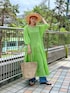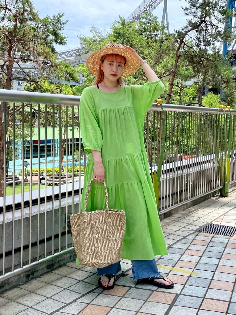 夏らしいカラーのワンピースはバックデザインがとっても可愛いのです、、! ▶︎ワンピース サイズ感 ゆったり大きめでボディラインを拾いません。 とてもリラックス感のあるサイズです。 158cmで足首しっかり見える丈なので、パンツ合わせが自分的にはしっくりきます。 バックのデザインが可愛いのでインナーも見せるタイプの物だと尚よしですね◎ 着心地 さらっと薄手の生地で少し透け感があります。 ティアードのデザインですが甘くなり過ぎないので着やすいです◎ あと七分袖なので夏場も日焼けしたくない人は助かります、、!! ▶︎デニム サイズ感 25着用。 ぺたんこ靴でジャスト丈です。 程よいフレアデザインなので一枚着でもワンピースなどの下に合わせても可愛いです! 着心地 柔らかめのデニムで履き心地抜群です◎ ライトブルーが夏らしくていいですね^ ^ ▶︎バッグ サイズ感 マチがしっかりあるのでお荷物たくさん入れられます。 しっかり編まれてる生地なので長く使えますよ。